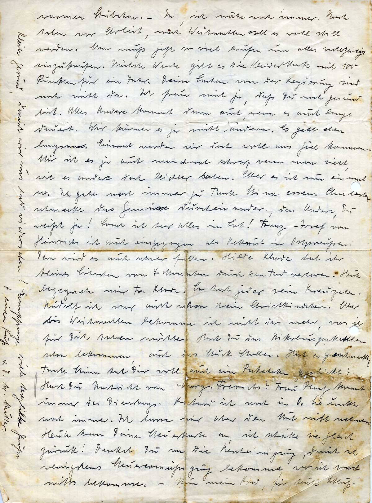 warmen Stübchen. – Ja, ich nähe noch immer. Noch haben wir Arbeit, nach Weihnachten soll es wohl still werden. Man muß jetzt so viel laufen um alles rechtzeitig einzukaufen. Nächste Woche gibt es die Kleiderkarte mit 100 Punkten für ein Jahr. Deine Sachen von der Regierung sind noch nicht da. Ich freue mich ja, daß Du noch gesund bist. Alles Andere kommt dann auch, wenn es auch lange dauert. Wir können es ja nicht ändern. Es geht eben langsam. Einmal werden wir doch wohl ans Ziel kommen. Mir ist es ja auch manchmal schwer, wenn man sieht, wie es andere doch leichter haben. Aber es ist nun einmal so. Ich gehe noch immer zu Tante Stina essen. Am besten schmeckt das Gemüse durcheinander, das Andere, Du weißt ja! Sonst ist hier alles im Lot! Franz-Josef von Heinrichs ist auch eingezogen als Rekrut in Ostpreußen. Dem wird es auch schwer fallen. Hilde Klode hat ihr kleines Söhnchen von 4 Monaten durch den Tod verloren. Heute begegnete mir Fr. Klode. So hat jeder sein Kreuzchen. Rudolf ich war auch schon beim Christkindchen. Aber bis Weihnachten bekomme ich nicht das mehr, was ich für Dich haben möchte. Hast Du das Nikolauspaketchen schon bekommen, auch das Stück Stollen. Hat es geschmeckt? Tante Stina hat Dir wohl auch ein Paketchen geschickt?