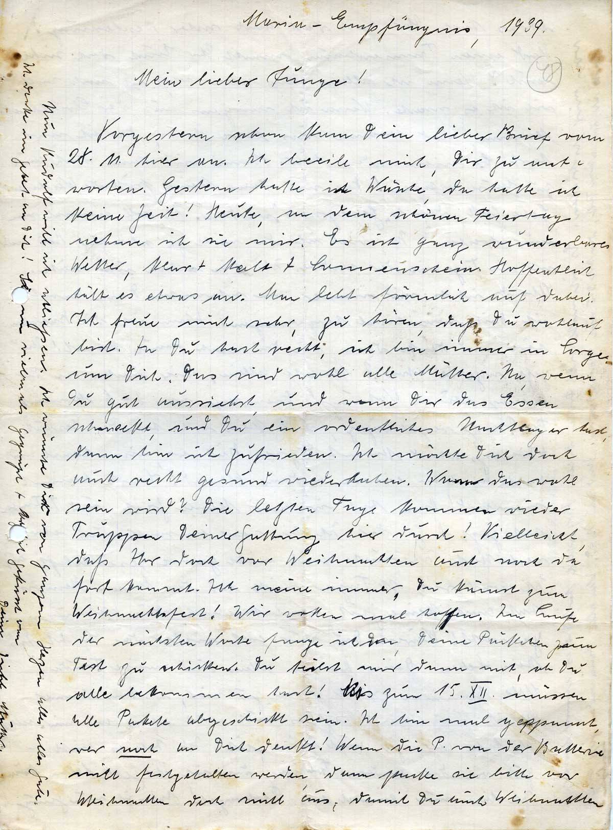 Vorgestern schon kam Dein lieber Brief vom 28.11. hier an. Ich beeile mich, Dir zu antworten. Gestern hatte ich Wäsche, da hatte ich keine Zeit! Heute, an dem schönen Feiertag nehme ich sie mir. Es ist ganz wunderbares Wetter, klar + kalt + Sonnenschein. Hoffentlich hält es etwas an. Man lebt förmlich auf dabei. Ich freue mich sehr, zu hören, daß Du wohlauf bist. Ja Du hast recht, ich bin immer in Sorge um Dich. Das sind wohl alle Mütter. Na, wenn Du gut aussiehst, und wenn Dir das Essen schmeckt, und Du ein ordentliches Nachtlager hast, dann bin ich zufrieden. Ich möchte Dich doch auch recht gesund wiederhaben. Wann das wohl sein wird? Die letzten Tage kommen wieder Truppen Deiner Gattung hier durch! Vielleicht, daß Ihr doch vor Weihnachten auch noch da fort kommt. Ich meine immer, Du kämst zum Weihnachtsfest! Wir wollen mal hoffen. Im Laufe der nächsten Woche fange ich an, Deine Päckchen zum Fest zu schicken. Du teilst mir dann mit, ob Du alle bekommen hast! Bis zum 15.XII. müssen alle Pakete abgeschickt sein. Ich bin mal gespannt, wer noch an Dich denkt! Wenn die P. von der Batterie nicht festgehalten werden, dann packe sie bitte vor Weihnachten doch nicht aus; damit Du auch Weihnachten