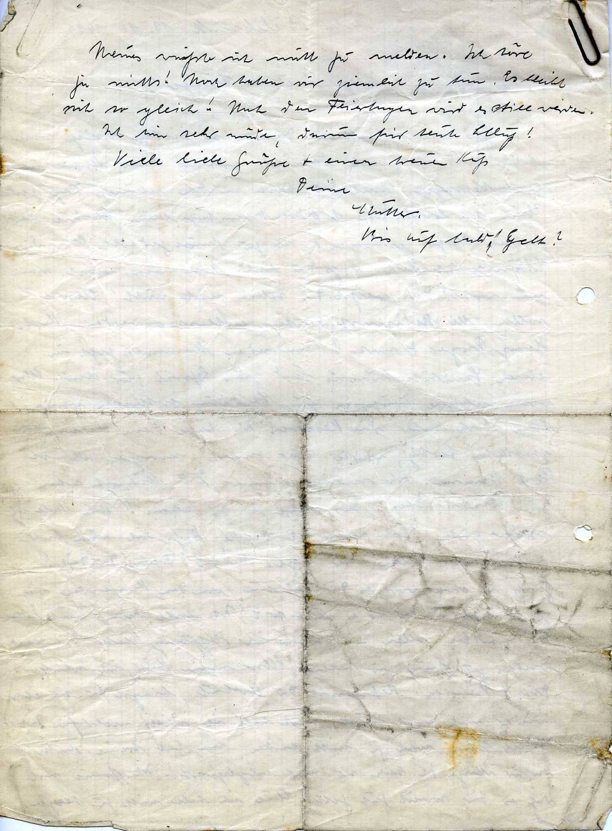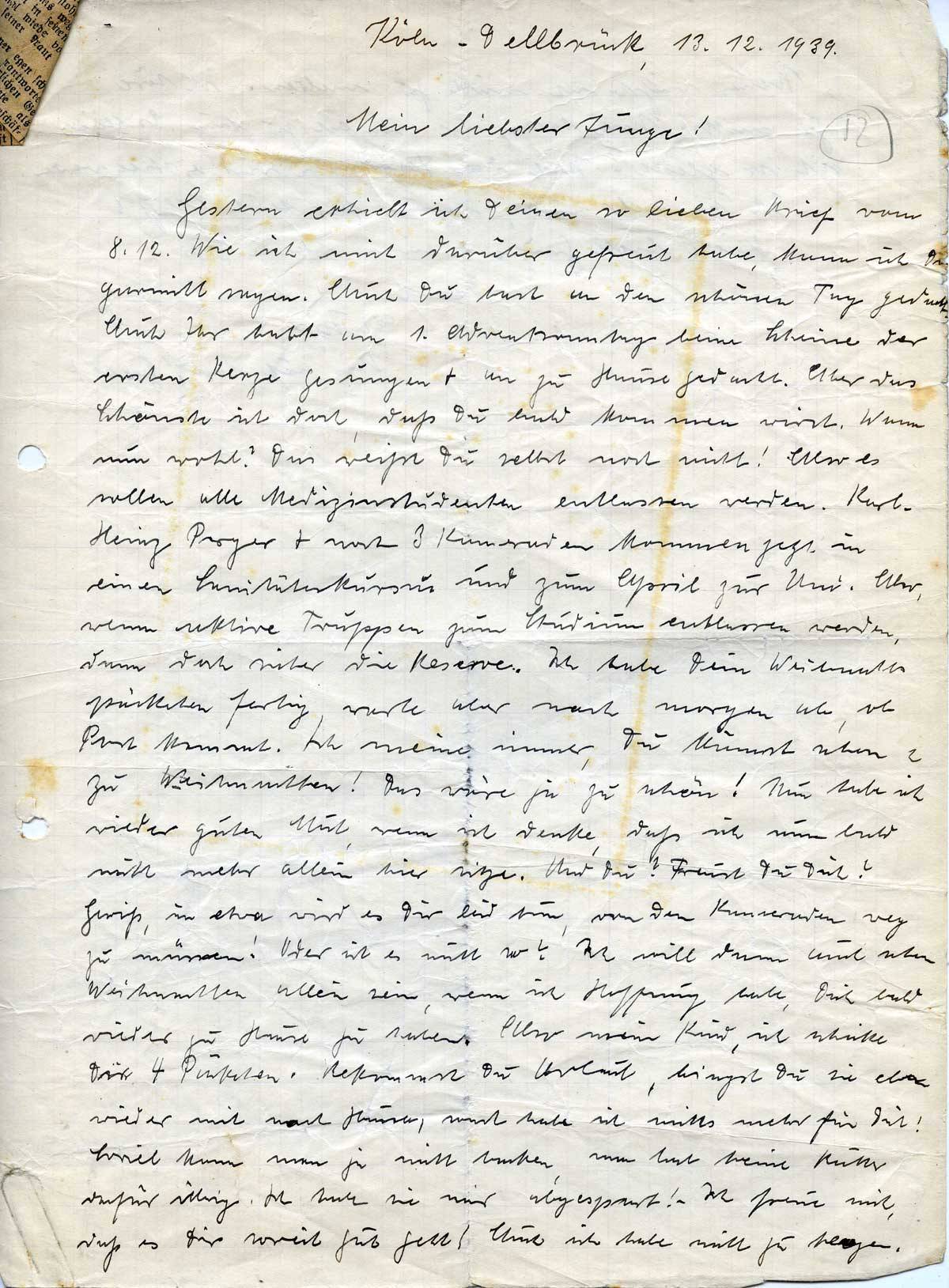Gestern erhielt ich Deinen so lieben Brief vom 8.12. Wie ich mich darüber gefreut habe, kann ich Dir garnicht sagen. Auch Du hast an den schönen Tag gedacht. Auch Ihr habt am 1. Adventssonntag beim Scheine der ersten Kerze gesungen + an zu Hause gedacht. Aber das Schönste ist doch, daß Du bald kommen wirst. Wann nun wohl? Das weißt Du selbst noch nicht! Aber es sollen alle Medizinstudenten entlassen werden. Karl-Heinz Perger + noch 3 Kameraden kommen jetzt in einen Sanitäterkursus und zum April zur Uni. Aber, wenn aktive Truppen zum Studium entlassen werden, dann doch sicher die Reserve. Ich habe Dein Weihnachtspäckchen fertig, warte aber noch morgen ab, ob Post kommt. Ich meine immer, Du kämst schon zu Weihnachten! Das wäre ja zu schön! Nun habe ich wieder guten Mut, wenn ich denke, daß ich nun bald nicht mehr allein hier sitze. Und Du? Freust Du Dich? Gewiß, in etwa wird es Dir leid tun, von den Kameraden weg zu müssen! Oder ist es nicht so? Ich will dann auch schon Weihnachten allein sein, wenn ich Hoffnung habe, Dich bald wieder zu Hause zu haben. Also mein Kind, ich schicke Dir 4 Päckchen. Bekommst Du Urlaub, bringst Du sie aber wieder mit nach Hause, sonst habe ich nichts mehr für Dich! Soviel kann man ja nicht backen, man hat keine Butter dafür übrig. Ich habe sie mir abgespart! Ich freue mich, daß es Dir soweit gut geht! Auch ich habe nicht zu klagen.
