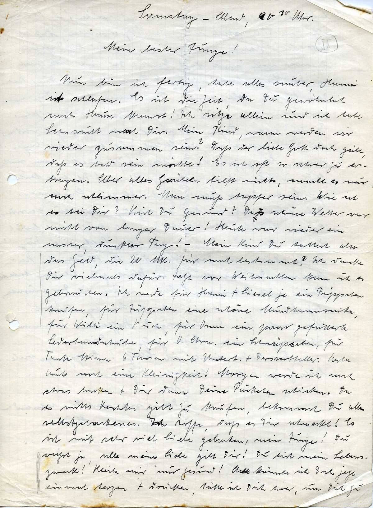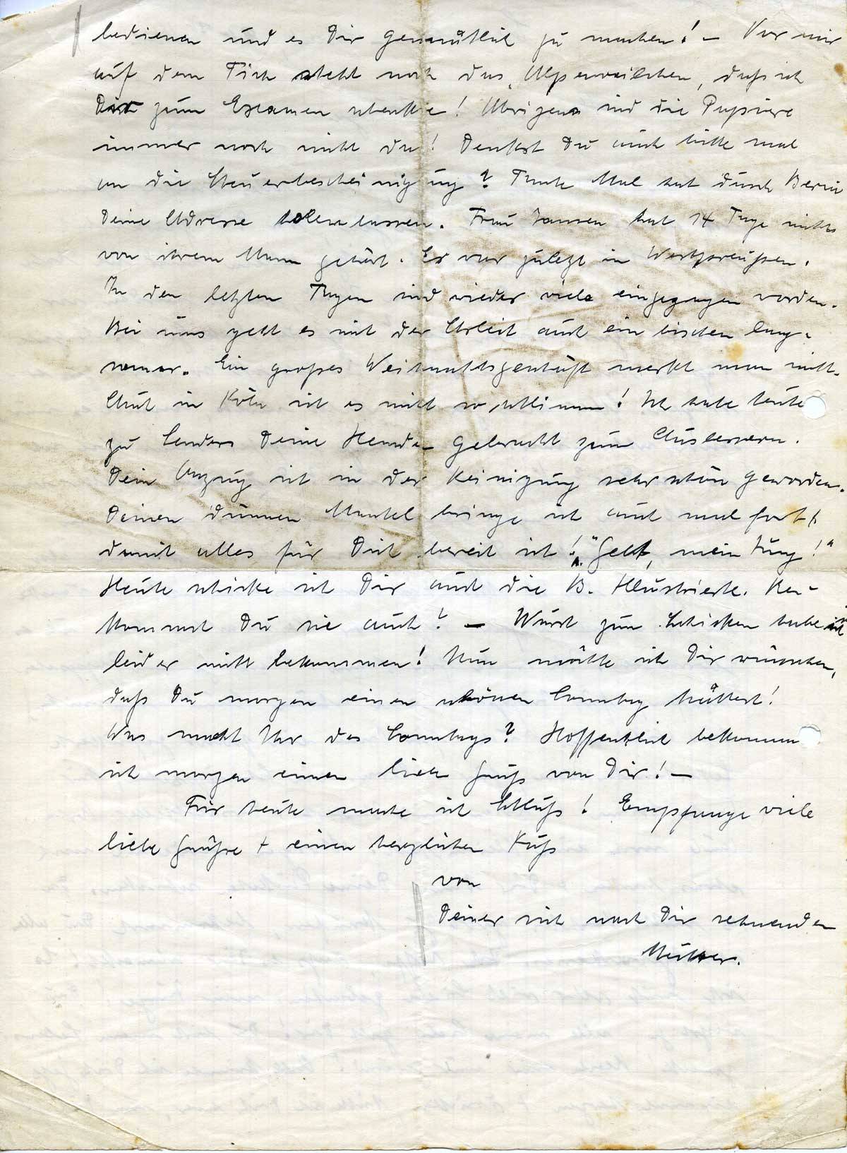 Nun bin ich fertig, habe alles sauber, Hanni ist schlafen. Es ist die Zeit, da Du gewöhnlich nach Hause kamst! Ich sitze allein und ich habe Sehnsucht nach Dir. Mein Kind, wann werden wir wieder zusammen sein? Daß der liebe Gott doch gäbe, daß es bald sein möchte! Es ist oft so schwer zu ertragen. Aber alles Grübeln hilft nichts, macht es nur noch schlimmer. Man muß tapfer sein. Wie ist es bei Dir? Bist Du gesund? Das schöne Wetter war nicht von langer Dauer! Heute war wieder ein nasser, dunkler Tag! – Mein Kind Du hattest also das Geld, die 20 Mk. für mich bestimmt? Ich danke Dir vielmals dafür. Jetzt vor Weihnachten kann ich es gebrauchen. Ich werde für Hanni + Liesel je ein Püppchen kaufen, für Jüppchen eine schöne Mundharmonika, für Willi ein Buch, für Oma ein paar gefütterte Lederhandschuhe, für O. Arn. ein Schnäpschen, für Tante Stina 6 Tassen mit Untert. + Dessertteller. Berta auch noch eine Kleinigkeit! Morgen werde ich noch etwas backen + Dir dann Deine Päckchen schicken. Da es nichts Rechtes gibt zu kaufen, bekommst Du alles selbstgebackenes. Ich hoffe, daß es Dir schmeckt! Es ist mit sehr viel Liebe gebacken, mein Junge! Du weißt ja, alle meine Liebe gilt Dir! Du bist mein Lebenszweck! Bleibe mir nur gesund! Ach könnte ich Dich jetzt einmal herzen + drücken, hätte ich Dich hier, um Dich zu