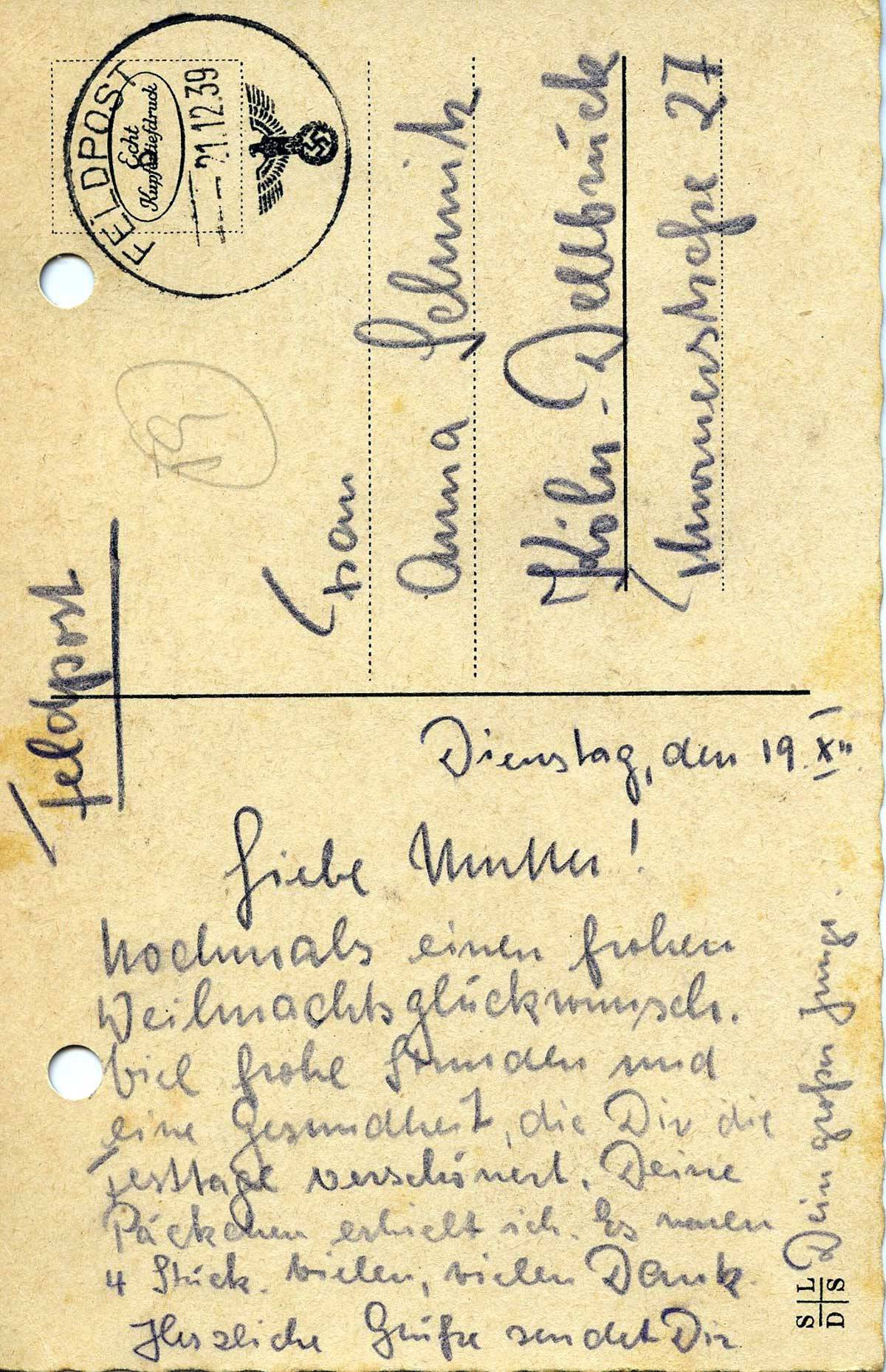 Rudolf Schmitz an Mutter Anna, 19. Dezember 1939