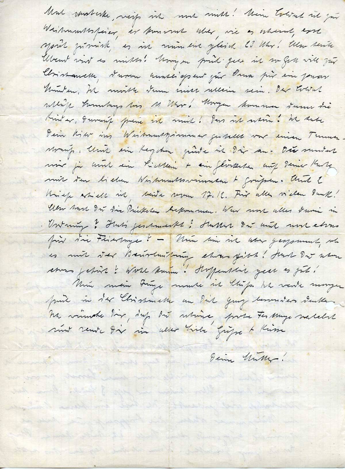 Nun mein Junge mache ich Schluß. Ich werde morgen früh in der Christmette an Dich ganz besonders denken. Ich wünsche Dir, daß Du schöne, frohe Festtage verlebst und sende Dir in alter Liebe Grüße + Küsse