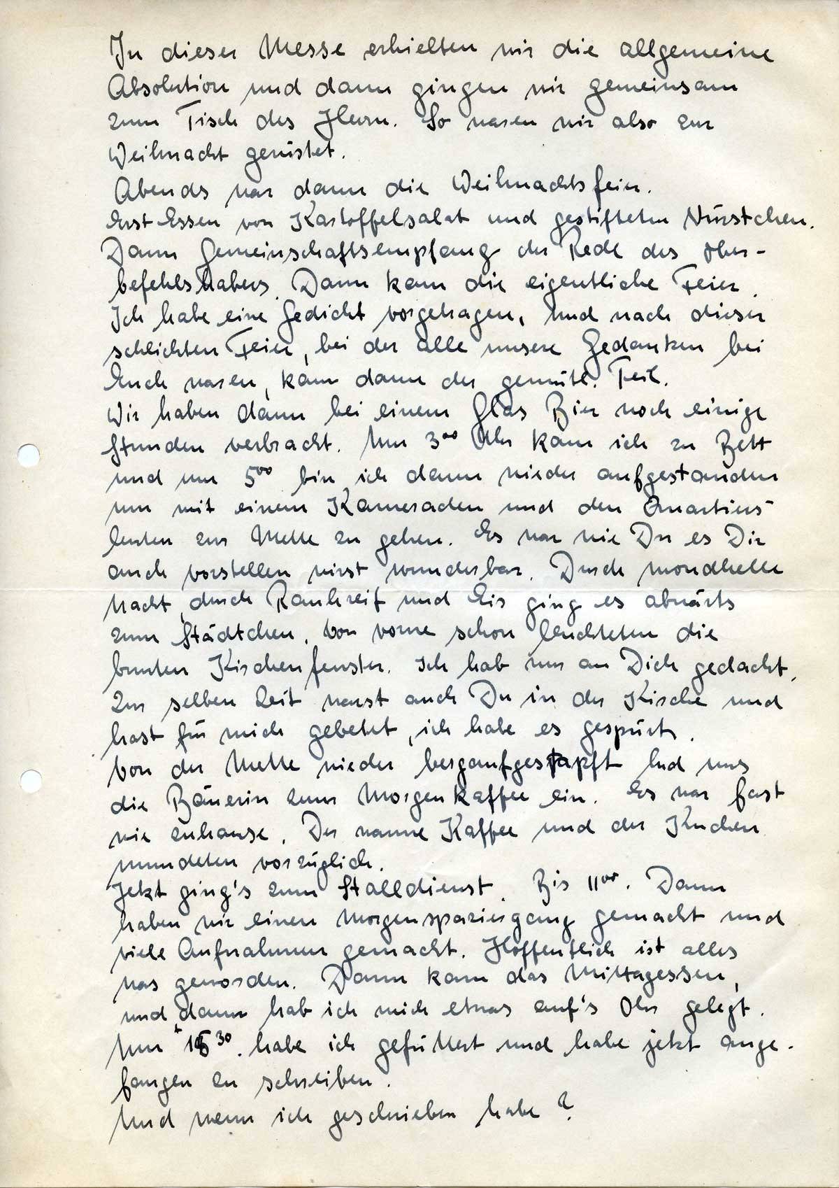 Wir haben dann bei einem Glas Bier noch einige Stunden verbracht. Um 3.00 Uhr kam ich zu Bett und um 5.00 bein ich dann wieder aufgestanden um mit einem Kameraden und den Quartiersleuten zur Mette zu gehen. Es war wie Du es Dir auch vorstellen wirst wunderbar. Durch mondhelle Nacht, durch Rauhreif und Eis ging es abwärts zum Städtchen, von vorne schon leuchteten die bunten Kirchenfenster. Ich hab nur an Dich gedacht. Zur selben Zeit warst auch Du in der Kirche und hast für mich gebetet, ich habe es gespürt.