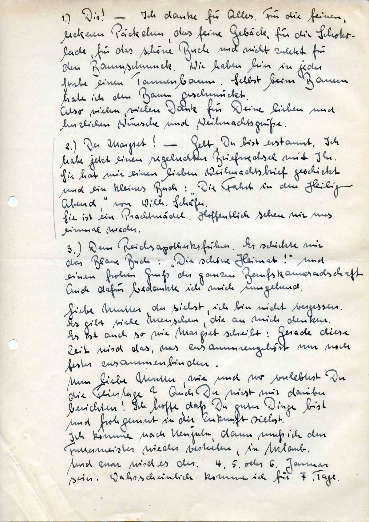 1.) Dir! – Ich danke für Alles. Für die feinen, leckeren Päckchen, das feine Gebäck, für die Schokolade, für das schöne Buch und nicht zuletzt für den Baumschmuck. Wir haben hier in jeder Stube einen Tannenbaum. Selbst beim Bauern habe ich den Baum geschmückt.