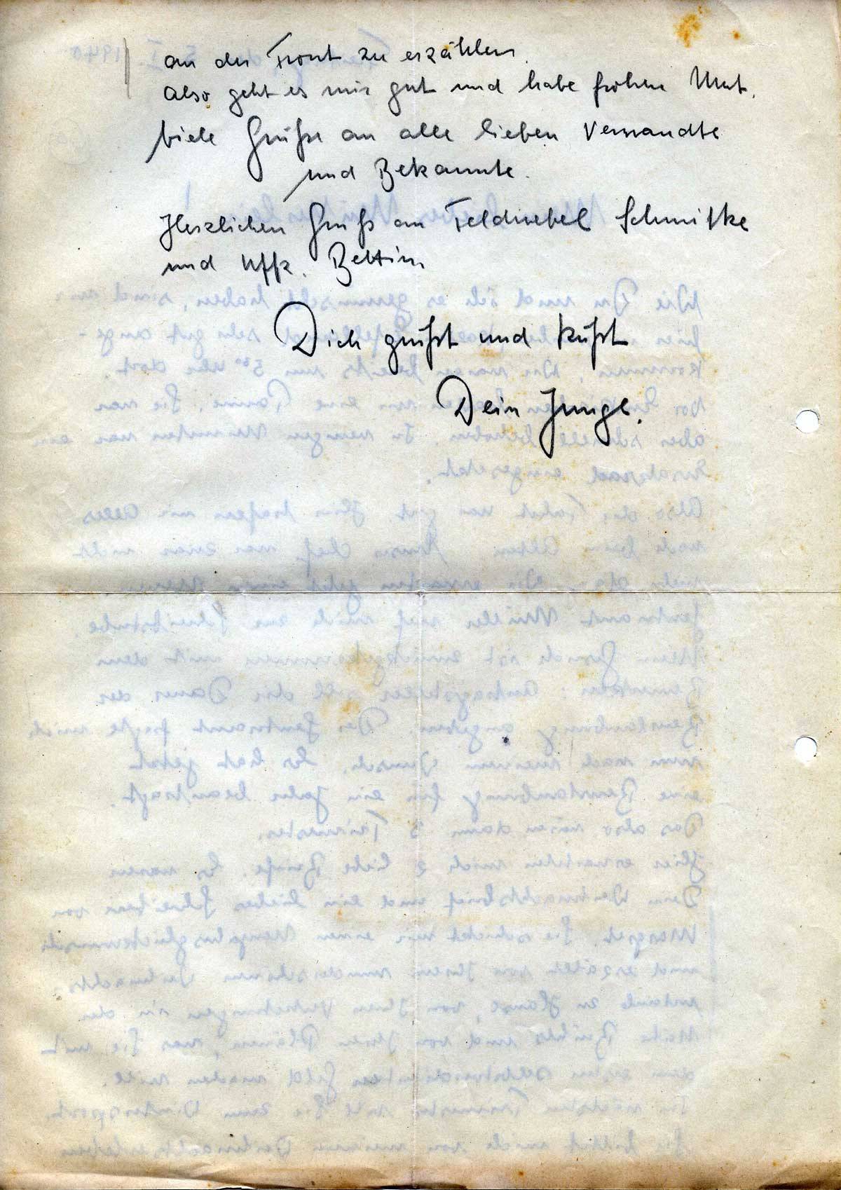 Also die Fahrt war gut. Hier trafen wir Alles noch beim Alten. Unser Chef war zwar nicht mehr da. Wir erwarten jetzt einen Neuen. Leutnant Müller rief mich zur Schreibstube. Mein Gesuch ist zurückgekommen mit dem Bemerken: Antragsteller soll die Dauer der Beurlaubung angeben. Der Leutnant fragte mich nun nach meinem Wunsch. Er hat jetzt eine Beurlaubung für ein Jahr beantragt. Das also wären dann 3 Trimester.