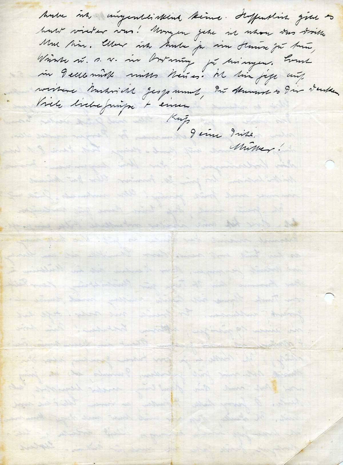 habe ich augenblicklich keine. Hoffentlich gibt es bald wieder was! Morgen gehe ich schon das dritte Mal hin. Aber ich habe ja im Hause zu tun, Wäsche u.s.w. in Ordnung zu bringen. Sonst in Dellbrück nichts Neues. Ich bin jetzt auf weitere Nachricht gespannt, Du kannst es Dir denken.
