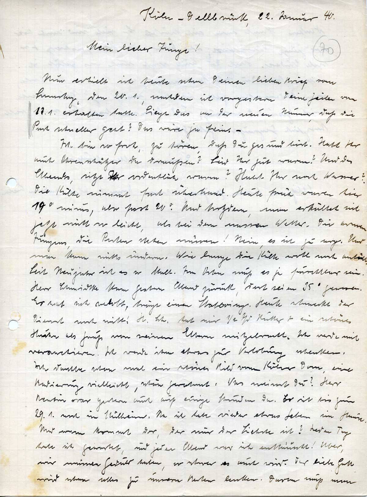 Ich bin so froh, zu hören, daß Du gesund bist. Habt Ihr auch Ohrenschützer da draußen? Seid Ihr gut warm? Und des Abends, sitzt Ihr ordentlich warm? Habt Ihr noch Wasser? Die Kälte nimmt fast überhand. Heute früh waren hier 19° minus, also fast 20°. Und trotzdem, man erkältet sich jetzt nicht so leicht. als bei dem nassen Wetter. Die armen Jungens, die Posten stehen müssen! Nein, es ist zu arg. Und man kann nichts ändern. Wie lange die Kälte wohl noch anhält. Seit Neujahr ist es so kalt. Im Osten muß es ja furchtbar sein. Herr Schmidtke kam gestern Abend zurück, dort seien 35° gewesen. Er hat sich verlobt, trägt einen Stahlring. Heute schmeckt der Dienst noch nicht! H. Sch. hat mir ½ Pfd. Butter + ein schönes Huhn als Gruß von seinen Eltern mitgebracht. Ich werde mich revanchieren. Ich werde ihm etwas zur Verlobung schenken. Ich dachte schon mal ein schönes Bild vom Kölner Dom, eine Radierung vielleicht, schön gerahmt. Was meinst Du? Herr Bentin war gestern auch auf einige Stunden da. Er ist bis zum 29.1. noch in Mülheim. Na ich habe wieder etwas Leben im Hause. Und wann kommt der, der mir der Liebste ist? Jeden Tag habe ich gewartet, und jeden Abend war ich enttäuscht! Aber, wir müssen Geduld haben, so schwer es auch wird. Der liebe Gott wird schon alles zu unserem Besten lenken. Daran muß man