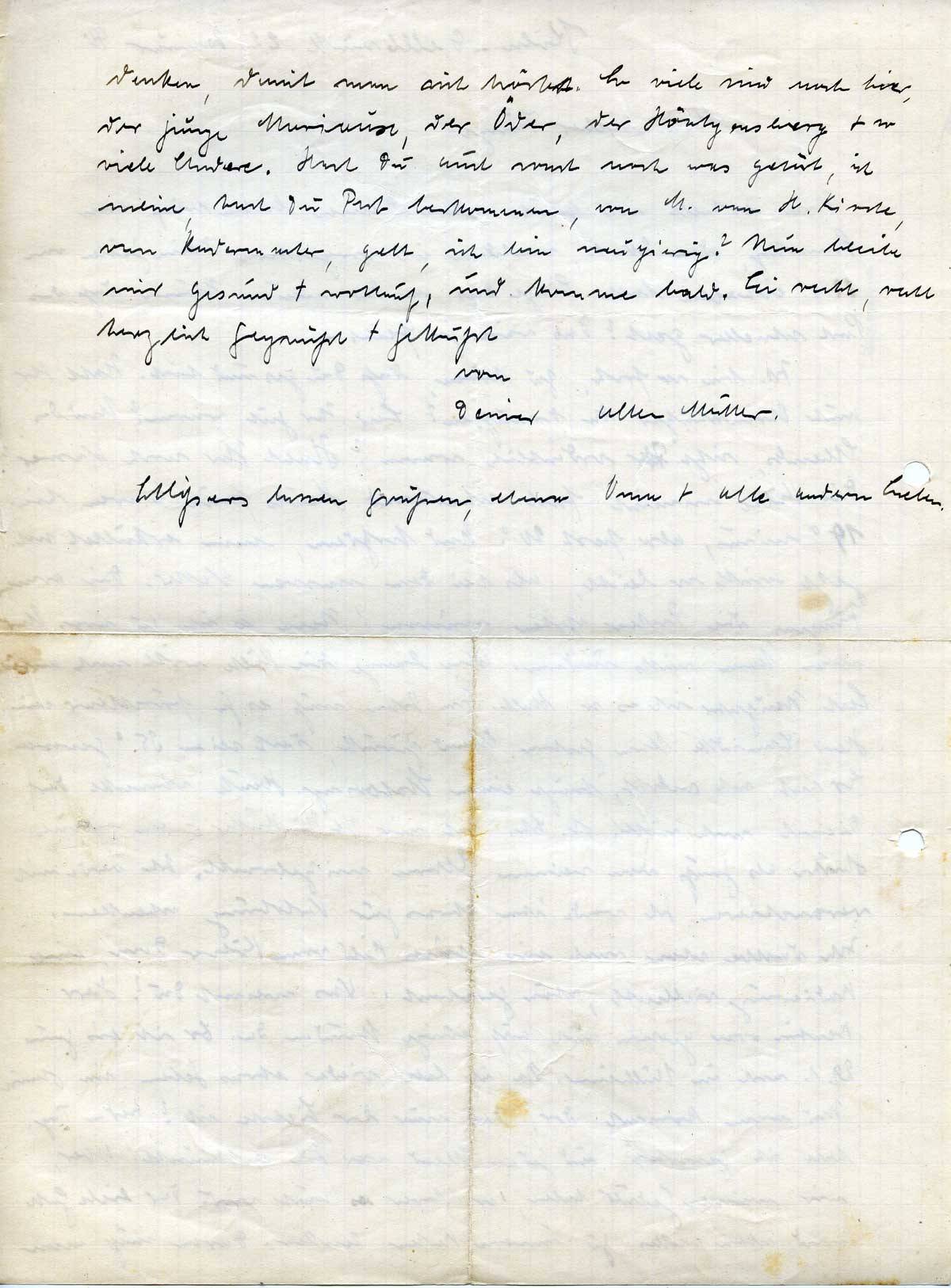 denken, damit man sich härtet. So viele sind noch hier, der junge Mariaux, der Öder, der Höntgensberg + so viele Andere. Hast Du auch sonst noch was gehört, ich meine, hast Du Post bekommen, von M. von H. Kirste, von Radermacher, gelt, ich bin neugierig? Nun bleibe mir gesund + wohlauf, und komme bald. Sei recht, recht herzlich gegrüßt + geküßt