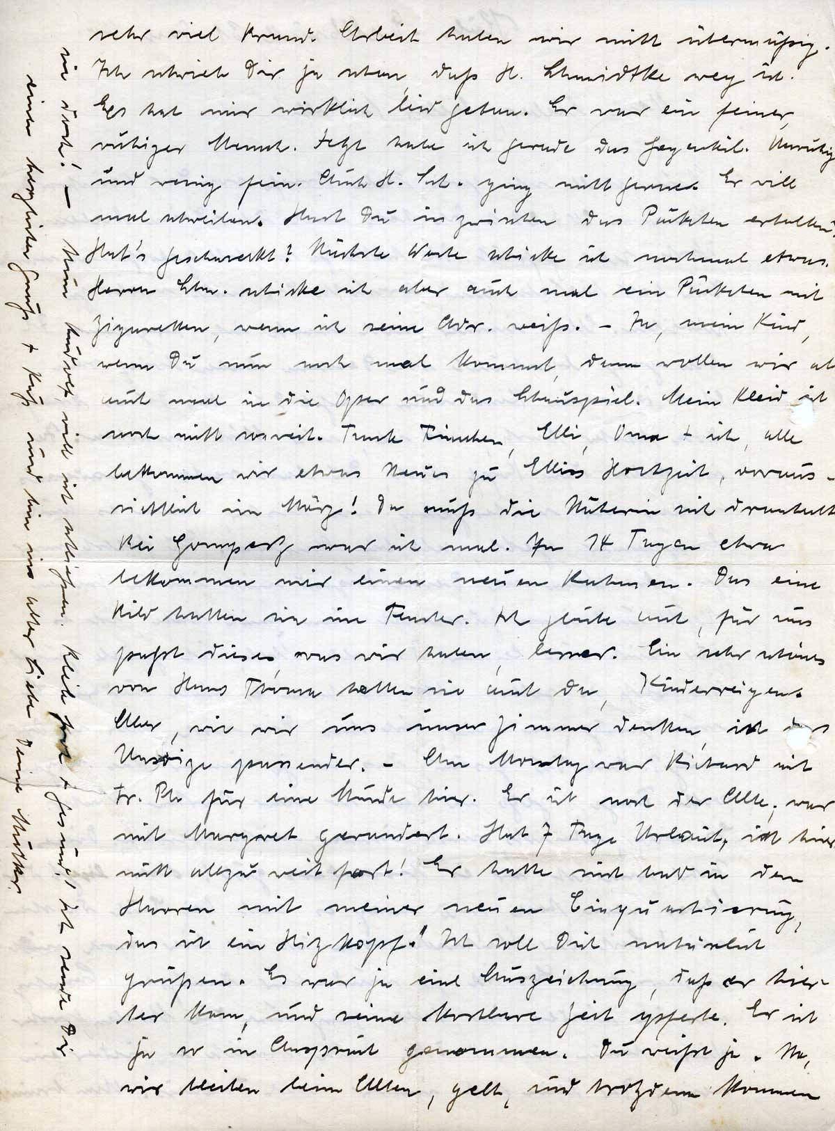 sehr viel Brand. Arbeit haben wir nicht übermäßig. Ich schrieb Dir ja schon, daß H. Schmidtke weg ist. Es hat mir wirklich leid getan. Er war ein feiner, ruhiger Mensch. Jetzt habe ich gerade das Gegenteil. Unruhig und wenig fein. Auch H. Sch. ging nicht gerne. Er will mal schreiben. Hast Du inzwischen das Päckchen erhalten? Hat’s geschmeckt? Nächste Woche schicke ich nochmal etwas. Herrn Schm. schicke ich aber auch mal ein Päckchen mit Zigaretten, wenn ich seine Adr. weiß. – Ja, mein Kind, wenn Du nun noch mal kommst, dann wollen wir aber auch mal in die Oper und das Schauspiel. Mein Kleid ist noch nicht so weit. Tante Finchen, Elli, Oma + ich, alle bekommen wir etwas Neues zu Ellis Hochzeit, voraussichtlich im März! Da muß die Näherin sich dranhalten. Bei Gompertz war ich mal. In 14 Tagen etwa bekommen wir einen neuen Rahmen. Das eine Bild hatten sie im Fenster. Ich glaube auch, für uns paßt dieses, was wir haben, besser. Ein sehr schönes von Hans Thoma hatten sie auch da, Kinderreigen. Aber, wie wir uns unser Zimmer denken, ist das Unsrige passender. – Am Montag war Richard mit Fr. Pl. für eine Stunde hier. Er ist noch der Alte; war mit Margaret gewandert. Hat 7 Tage Urlaub, ist hier nicht allzu weit fort! Er hatte sich bald in den Haaren mit meiner neuen Einquartierung, das ist ein Hitzkopf! Ich soll Dich natürlich grüßen. Es war ja eine Auszeichnung, daß er hierher kam, und seine kostbare Zeit opferte. Er ist ja so in Anspruch genommen. Du weißt ja. Na, wir bleiben beim Alten, gelt, und trotzdem kommen