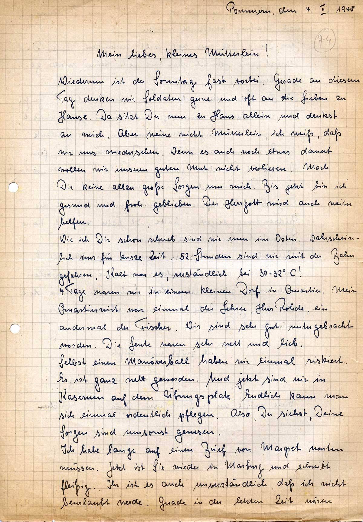 Wiederum ist der Sonntag fast vorbei. Gerade an diesem Tag, denken wir Soldaten gerne und oft an die Lieben zu Hause. Da sitzt Du nun zu Haus, allein und denkst an mich. Aber weine nicht Mütterlein, ich weiß, daß wir uns wiedersehen. Wenn es auch noch etwas dauert wollen wir unseren guten Mut nicht verlieren. Mach Dir keine allzu große Sorgen um mich. Bis jetzt bin ich gesund und froh geblieben. Der Herrgott wird auch weiter helfen.
