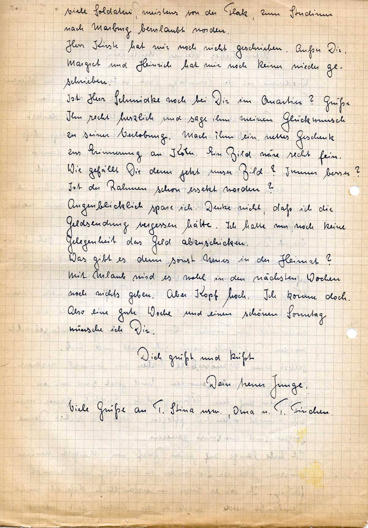 Viele Grüße an T. Stina usw., Oma u. T. Finchen.