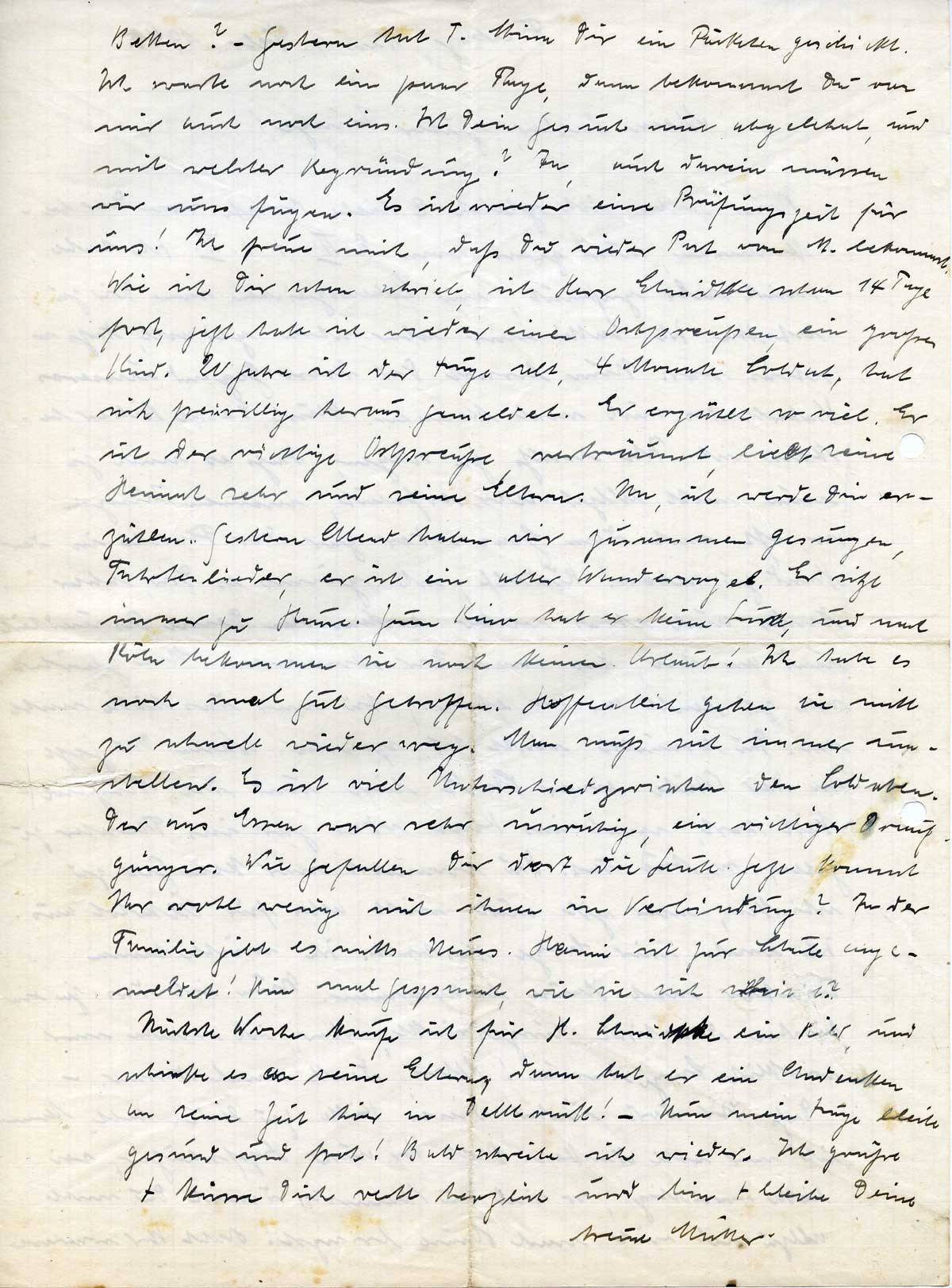 Betten? – Gestern hat T. Stina Dir ein Päckchen geschickt. Ich warte noch ein paar Tage, dann bekommst Du von mir auch noch eins. Ist Dein Gesuch nun abgelehnt, und mit welcher Begründung? Ja, auch darein müssen wir uns fügen. Es ist wieder eine Prüfungszeit für uns! Ich freue mich, daß Du wieder Post von M. bekommst.
