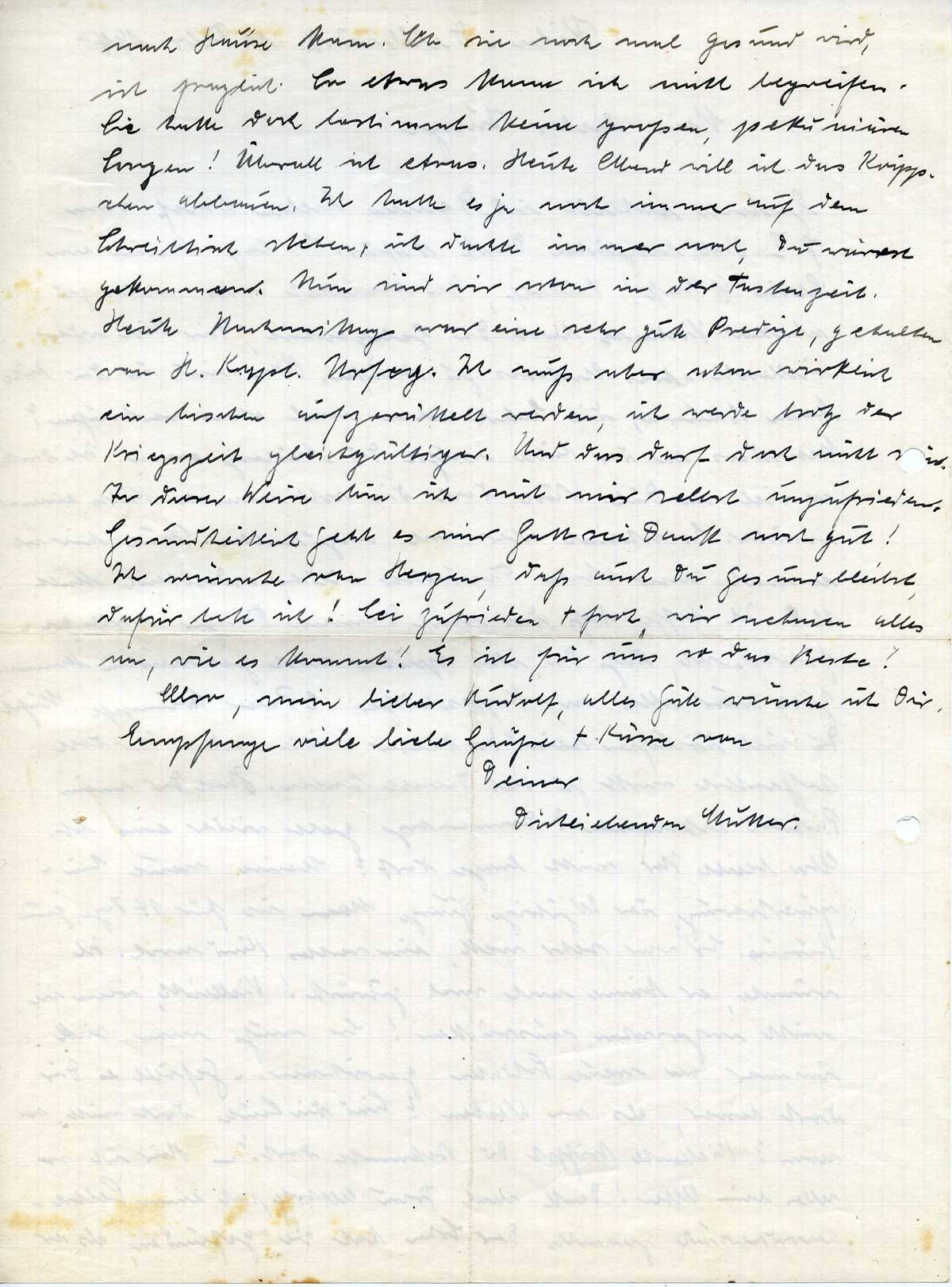 nach Hause kam. Ob sie noch mal gesund wird, ist fraglich. So etwas kann ich nicht begreifen. Sie hatte doch bestimmt keine großen, pekuniären Sorgen! Überall ist etwas. Heute Abend will ich das Krippchen abbauen. Ich hatte es ja noch immer auf dem Schreibtisch stehen, ich dachte immer noch, Du wärest gekommen. Nun sind wir schon in der Fastenzeit. Heute Nachmittag war eine sehr gute Predigt, gehalten von H. Kapl. Ursag. Ich muß aber schon wirklich ein bischen aufgerüttelt werden, ich werde trotz der Kriegszeit gleichgültiger. Und das darf doch nicht sein. In dieser Weise bin ich mit mir selbst unzufrieden. Gesundheitlich geht es mir Gott sei Dank noch gut! Ich wünsche von Herzen, daß auch Du gesund bleibst, dafür bete ich! Sei zufrieden + froh, wir nehmen alles an, wie es kommt! Es ist für uns so das Beste!
