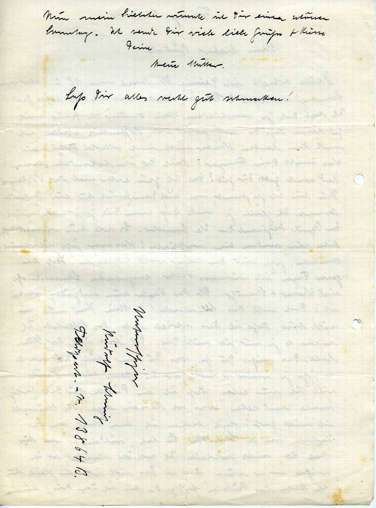Heute erhielt ich Deinen lb. Brief vom 18.2. also vom Samstag, inliegend 2 Mk. Ich denke, das ist das letzte Geld. Ich bat Dich ja verschiedene Male darum. Ich freue mich, zu hören, daß Du noch gesund bist. Hoffentlich stellen sich nach dem harten Winter nicht noch allerlei Folgen ein. Was macht Dein Finger? Hast Du ihn behandeln lassen? Und sonst geht’s Dir gut? Das ist zum ersten Mal das Wichtigste. Nun bin ich gespannt, was auf Dein Gesuch für eine Antwort kommt. Ich glaube ja nicht, daß man Dich jetzt noch freiläßt. Im April beginnt das 2te Semester. Es soll kein wissenschaftliches sein, sondern ein praktisches! Was mag jetzt überhaupt kommen. Jetzt wird der Krieg wohl anfangen. Seit ein paar Tagen ist wärmeres Wetter eingetreten, Schneeschmelze, viel Wasser + Schmutz. Ob der Winter nun endgültig vorbei ist? Doch wohl das Schlimmste! – Mein Kind nun sei nicht böse, daß ich das schrieb betr. des Alkohols. Ich meine es ja nur gut mit Dir. Du bist doch der Allerbeste. Das weißt Du ja, was Du mir bist! Ich merke es jetzt ja wieder so recht, wo Du ferne bist! Heute will ich nun sehen, daß ich ein Päckchen für Dich fertig mache, mal sehen, was ich hinein lege. Die Auswahl ist nicht groß! Heute bekam ich einen Brief von der Verlobten von H. Schmidtke. Sie hat, seitdem er von hier fort ist, nicht geschrieben. Ich soll ihr schreiben, ob ich wußte wo er wäre u.s.w. Das will ich nun gleich tun! Ich habe das Päckchen fertig, da tue ich den Brief hinein.