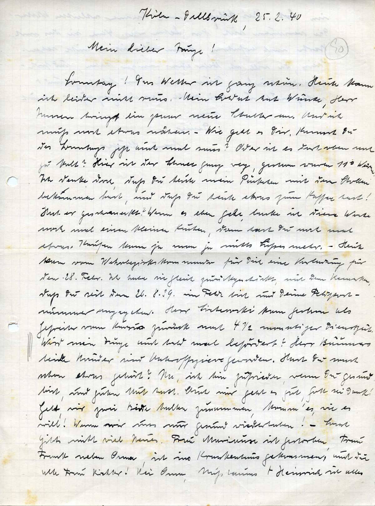 Sonntag! Das Wetter ist ganz schön. Heute kann ich leider nicht raus. Mein Soldat hat Wünsche[?], Herr Jansen bringt ein paar neue Schalter an. Und ich muß noch etwas nähen. – Wie geht es Dir. Kommst Du des Sonntags jetzt auch mal raus? Oder ist es dort oben noch zu kalt? Hier ist der Schnee ganz weg, gestern waren 11° Wärme. Ich denke doch, daß Du heute mein Päckchen mit dem Stollen bekommen hast, und daß Du heute etwas zum Kaffee hast! Hat er geschmeckt? Wenn es eben geht, backe ich diese Woche noch mal einen kleinen Kuchen, dann hast Du noch mal etwas. Kaufen kann ja man ja nichts Süßes mehr. – Heute kam vom Wehrbezirkskommando für Dich eine Verladung für den 28. Febr. Ich habe sie gleich zurückgeschickt, mit dem Bemerken, daß Du seit dem 26.8.39 im Felde bist und Deine Feldpostnummer angegeben. Herr Sichowski kam gestern als Gefreiter vom Kursus zurück nach 4 ½ monatiger Dienstzeit. Wird mein Junge auch bald mal befördert? Herr Bäumers beide Brüder sind Unteroffiziere geworden. Hast Du sonst schon etwas gehört? Na, ich bin zufrieden, wenn Du gesund bist, und guten Mut hast. Auch mir geht es gut, Gott sei Dank! Gelt, wir zwei Beide halten zusammen, komm‘ es, wie es will! Wenn wir uns nur gesund wiederhaben! – Sonst gibt’s nicht viel Neues. Frau Mariaux ist gestorben, Frau Frank neben Oma, ist ins Krankenhaus gekommen, und die alte Frau Kirchler! Bei Oma, Nußbaums + Heinrich ist alles