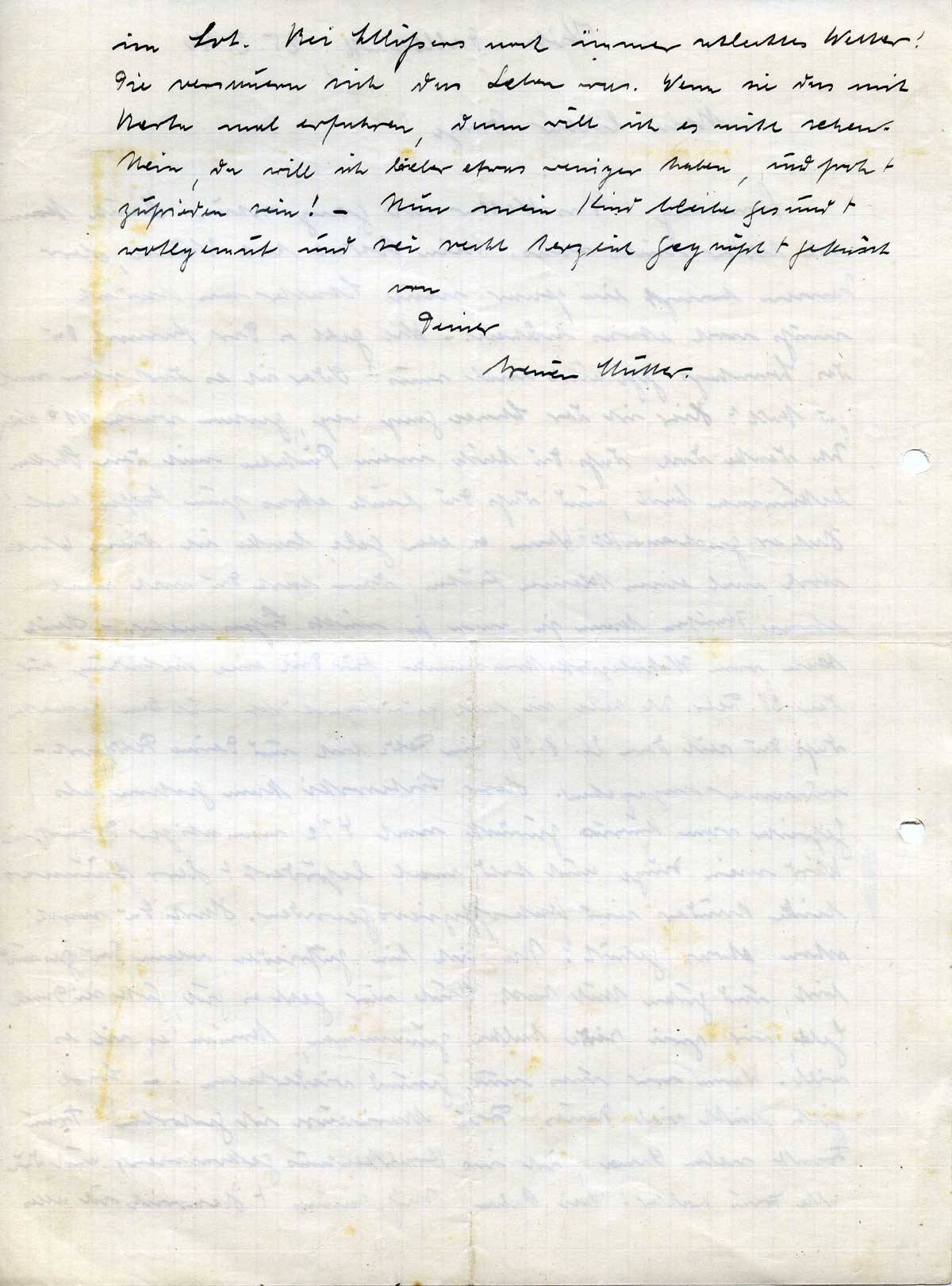 im Lot. Bei Schlößers noch immer schlechtes Wetter! Sie versauern sich das Leben nur. Wenn sie das mit Berta mal erfahren, dann will ich es nicht sehen. Nein, da will ich lieber etwas weniger haben, und froh + zufrieden sein! – Nun mein Kind bleibe gesund + wohlgemut und sei recht herzlich gegrüßt + geküsst