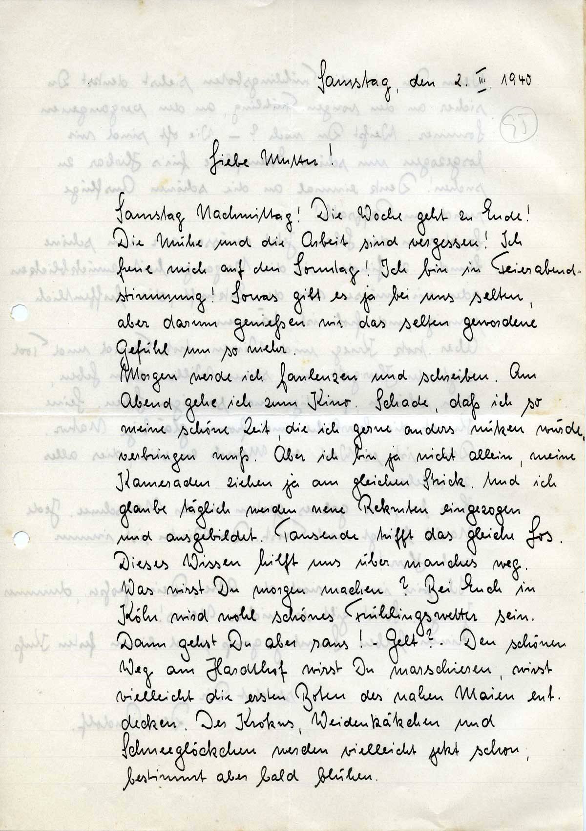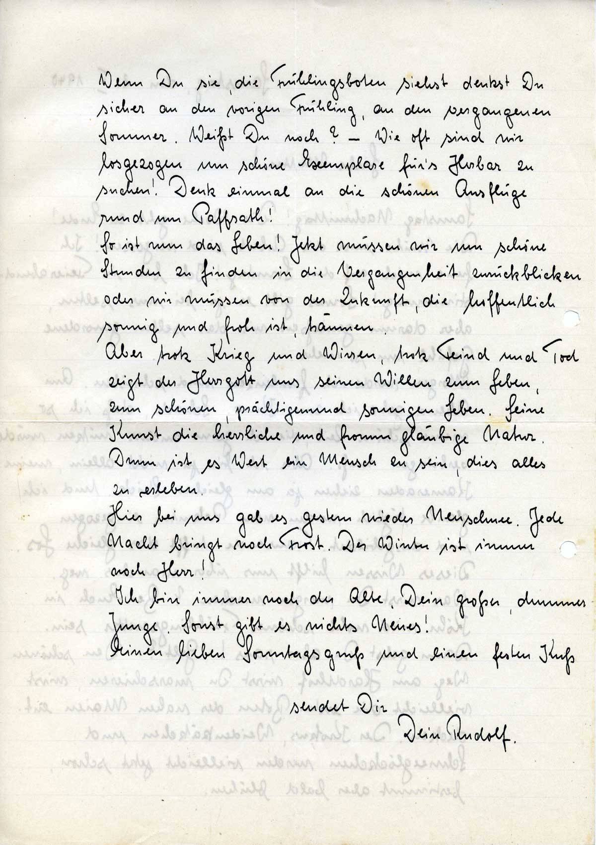 Morgen werde ich faulenzen und schreiben. Am Abend gehe ich zum Kino. Schade, daß ich so meine schöne Zeit, die ich gerne anders nützen würde, verbringen muß. Aber ich bin ja nicht allein, meine Kameraden ziehen ja am gleichen Strick. Und ich glaube täglich werden neue Rekruten eingezogen und ausgebildet. Tausende trifft das gleiche Los. Dieses Wissen hilft uns über manches weg. Was wirst Du morgen machen? Bei Euch in Köln wird wohl schönes Frühlingswetter sein. Dann gehst Du aber raus! – Gelt? – Den schönen Weg am Hardthof wirst Du marschieren, wirst vielleicht die ersten Boten des nahen Maien entdecken. Der Krokus, Weidenkätzchen und Schneeglöckchen werden vielleicht jetzt schon, bestimmt aber bald blühen.