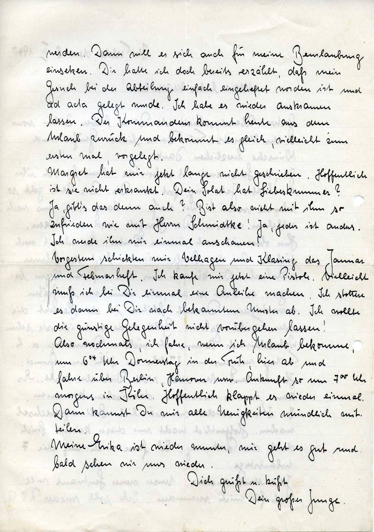 Margret hat mir jetzt lange nicht geschrieben. Hoffentlich ist sie nicht erkrankt. Dein Soldat hat Liebeskummer? Ja, gibt’s das denn auch? Bist also nicht mit ihm so zufrieden wie mit Herrn Schmidtke! Ja, jeder ist anders. Ich werde ihn mir einmal anschauen!