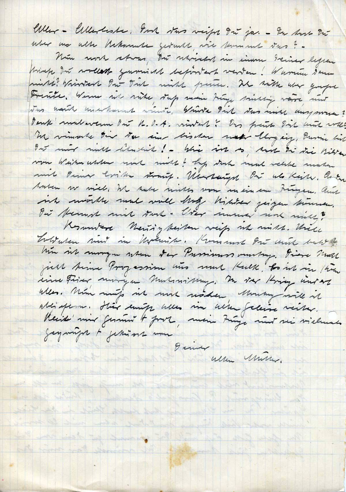 Nun noch etwas, Du schriebst in einem Deiner letzten Briefe, Du wolltest garnicht befördert werden! Warum denn nicht? Würdest Du Dich nicht freuen. Ich hätte aber große Freude. Wenn ich sähe, daß mein Junge tüchtig wäre, und das auch anerkannt würde. Würde Dich das nicht anspornen? Denk‘ mal wenn Du R.O.A. würdest? Das freute Dich auch wohl? Ich wünsche Dir da ein bischen mehr Ehrgeiz. Darin bist Du mir nicht ähnlich! – Wie ist es, hast Du die Bilder von Weihnachten noch nicht? Laß doch mal welche machen mit Deiner Erika drauf. Überhaupt Du als Reiter. Andere haben so viel. Ich habe nichts von meinem Jungen. Auch ich möchte mal voll Stolz Bilder zeigen können. Du kennst mich doch. Oder immer noch nicht?