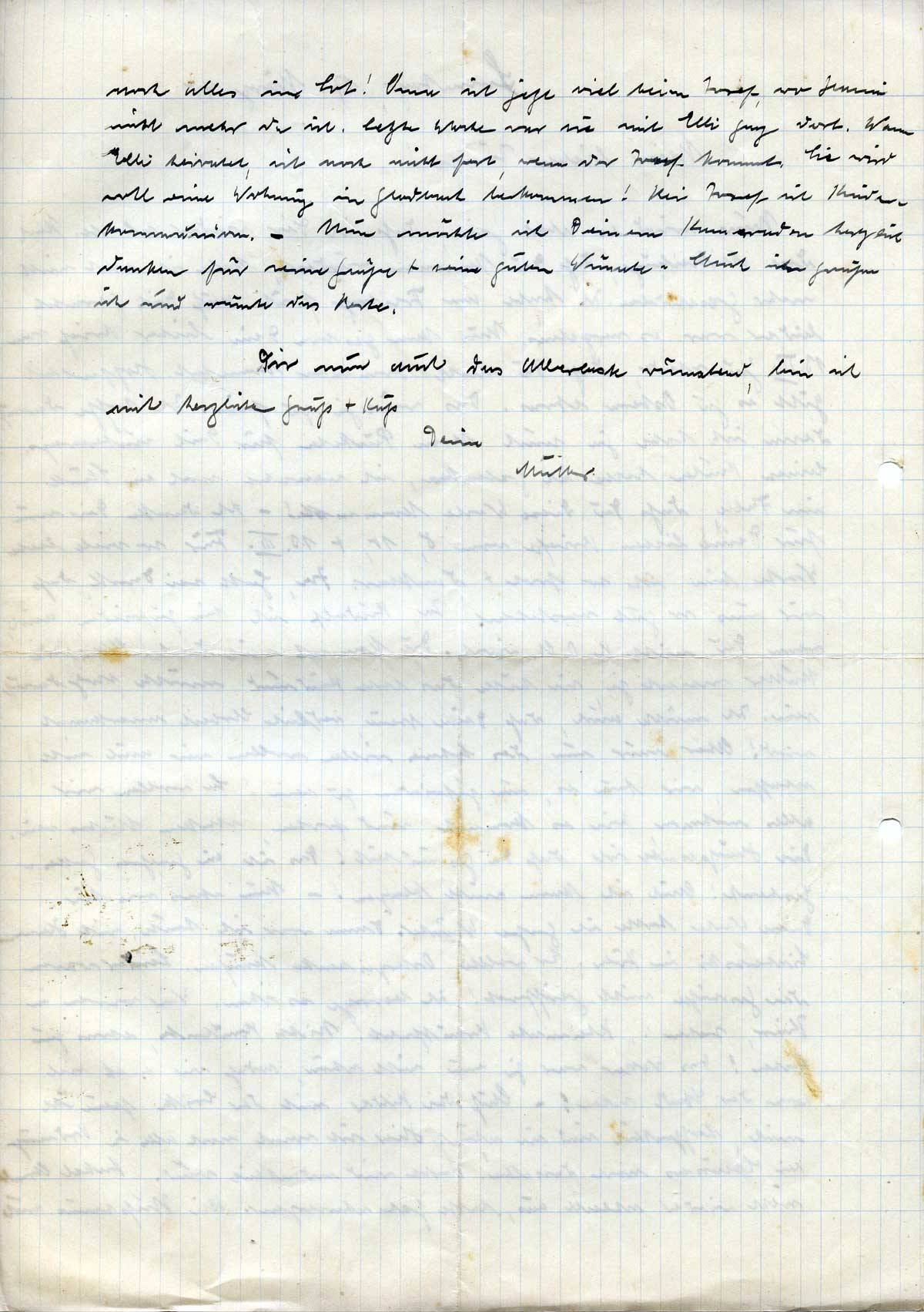 noch alles im Lot! Oma ist jetzt viel beim Josef, wo Hanni nicht mehr da ist. Letzte Woche war sie mit Elli ganz dort. Wann Elli heiratet, ist noch nicht fest, wenn der Josef kommt. Sie wird wohl eine Wohnung in Gladbach bekommen! Bei Josef ist Kinderkommunion. – Nun möchte ich Deinem Kameraden herzlich danken für seine Grüße + seine guten Wünsche. Auch ihn grüße ich und wünsche das Beste.