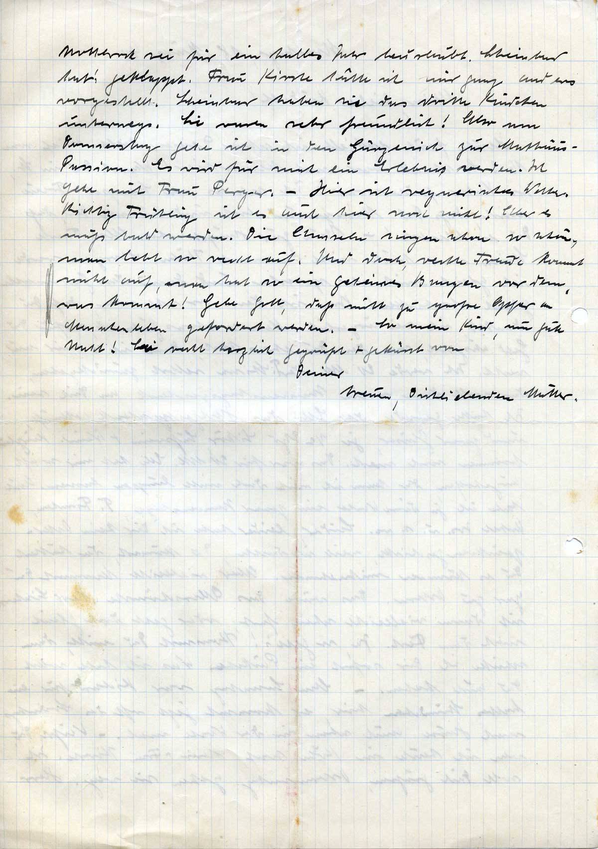 Nottbrock sei für ein halbes Jahr beurlaubt. Scheinbar hat’s geklappt. Frau Kirste hätte ich mir ganz anders vorgestellt. Scheinbar haben sie das dritte Kindchen unterwegs. Sie waren sehr freundlich! Also am Donnerstag gehe ich in den Gürzenich zur Matthäus-Passion. Es wird für mich ein Erlebnis werden. Ich gehe mit Frau Perger. – Hier ist regnerisches Wetter. Richtig Frühling ist es auch hier noch nicht! Aber es muß bald werden. Die Amseln singen schon so schön, man lebt so recht auf. Und doch, rechte Freude kommt nicht auf, man hat so ein geheures Bangen vor dem, was kommt! Gebe Gott, daß nicht zu große Opfer an Menschenleben gefordert werden. – So mein Kind, nun gute Nacht! Sei recht herzlich gegrüßt + geküsst von