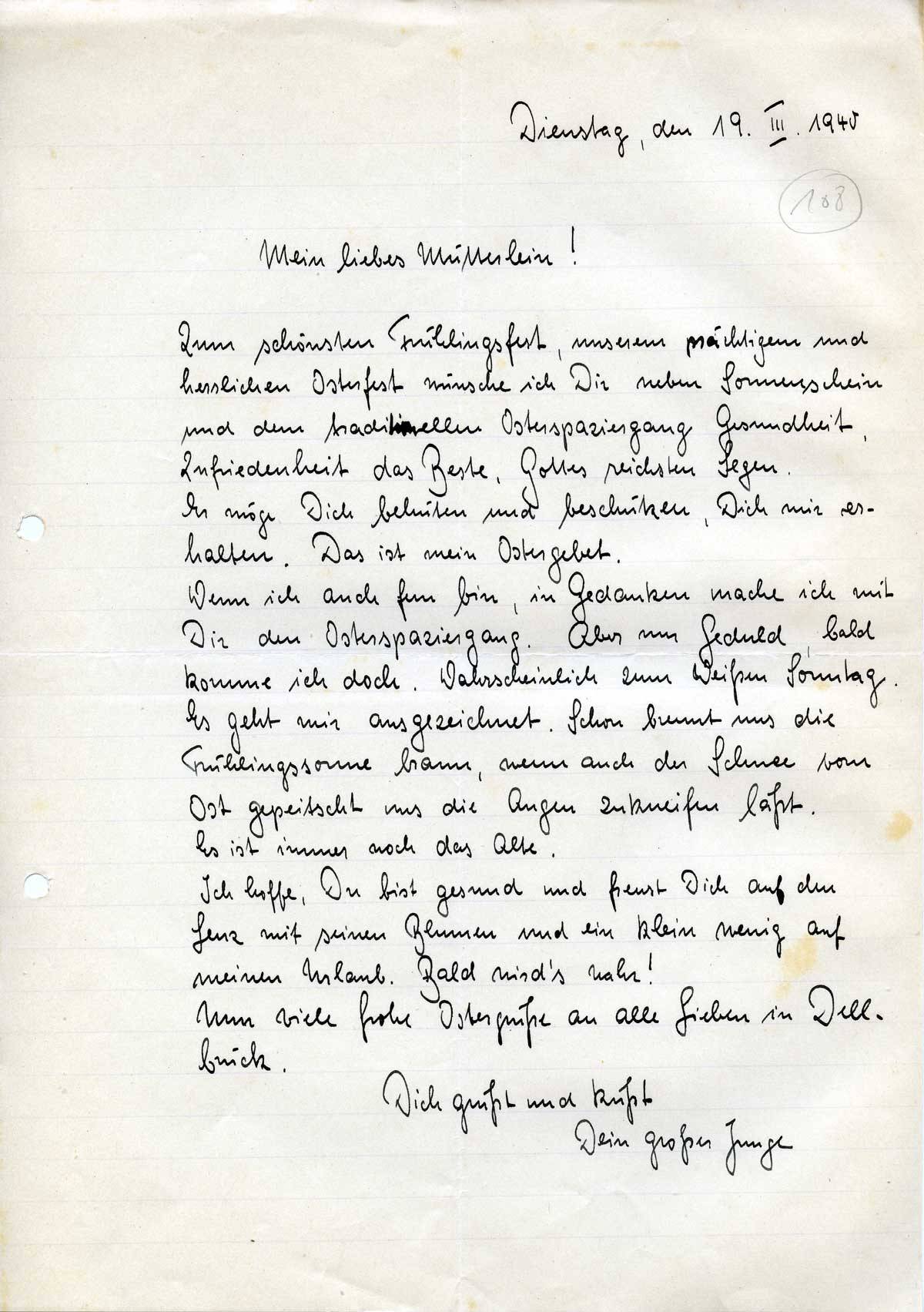 Wenn ich auch fern bin, in Gedanken mache ich mit Dir den Osterspaziergang. Aber nur Geduld, bald komme ich doch. Wahrscheinlich zum Weißen Sonntag. Es geht mir ausgezeichnet. Schon brennt uns die Frühlingssonne braun, wenn auch der Schnee vom Ost gepeitscht uns die Augen zukneifen läßt. Es ist immer noch das Alte.