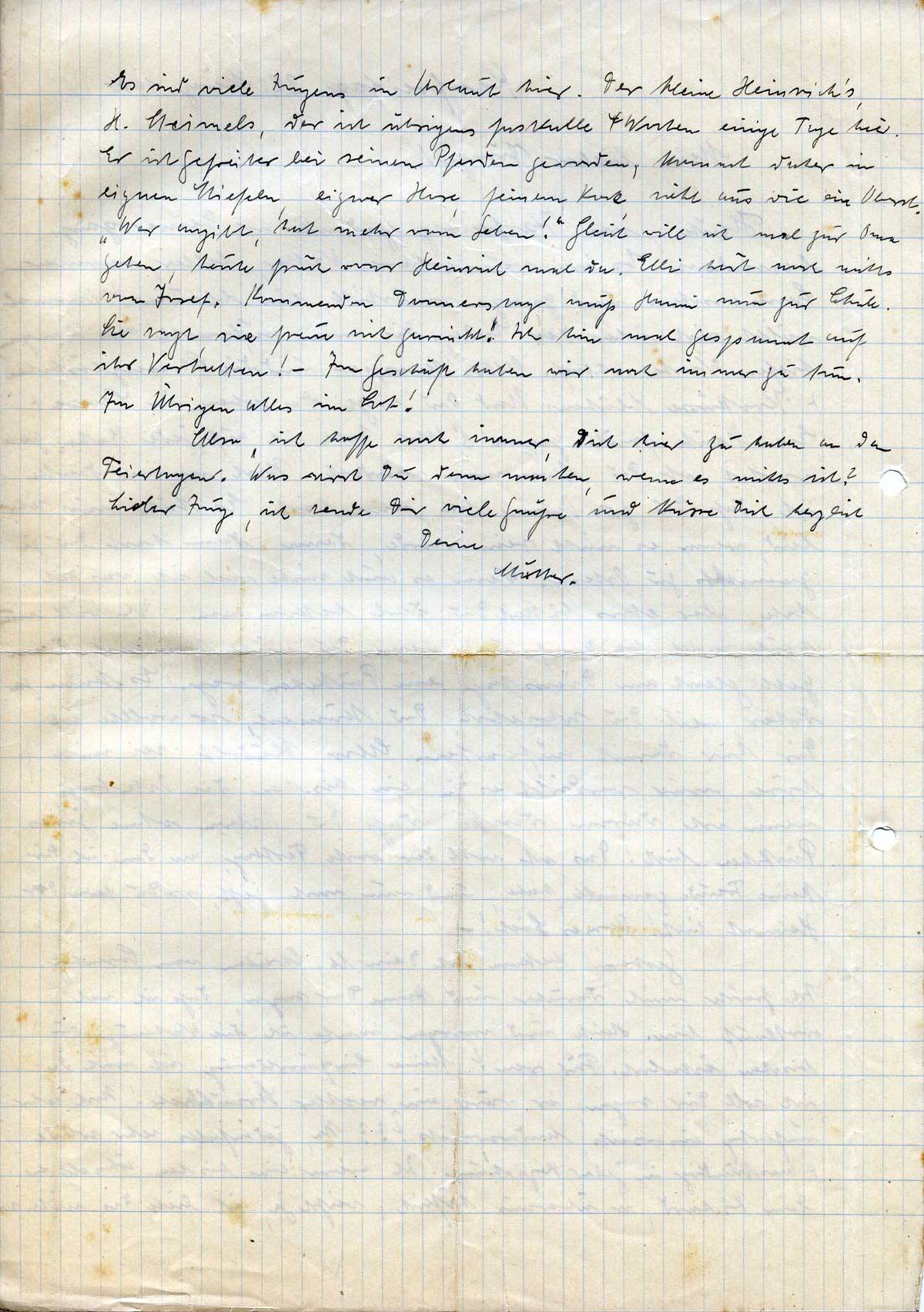 Es sind viele Jungens in Urlaub hier. Der kleine Heinrich’s, H. Steimels, der ist übrigens fast alle 4 Wochen einige Tage hier. Er ist Gefreiter bei seinen Pferden geworden, kommt daher in eignen Stiefeln, eigner Hose, feinem Rock, sieht aus wie ein Oberst. „Wer angibt, hat mehr vom Leben!“ Gleich will ich mal zur Oma gehen, heute früh war Heinrich mal da. Elli hört noch nichts von Josef. Kommenden Donnerstag muß Hanni nun zur Schule. Sie sagt, sie freue sich garnicht! Ich bin mal gespannt auf ihr Verhalten! – Im Geschäft haben wir noch immer zu tun. Im Übrigen alles im Lot!