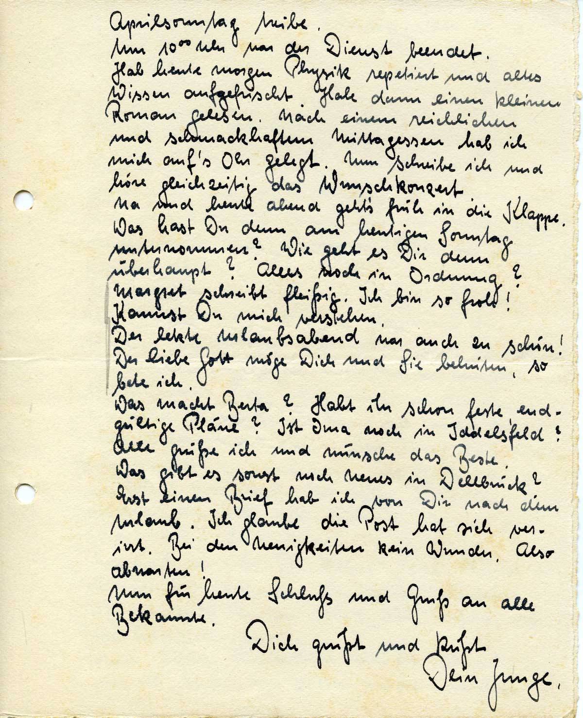 Ich bin gesund und guter Dinge. Ich und alle Kameraden verfolgen gespannt die Ereignisse im Norden, im Westen und zur See. Unsere Herzen schlagen höher hören wir von einem neuen Sieg. Hoffentlich werden auch wir bald wieder eingesetzt. Ich möchte doch auch dabeigewesen sein. Den Krieg auf einem Übungsplatz zu verbringen ist doch weniger erhebend. Für Euch, Ihr Lieben daheim möchten wir alles tuen, damit Ihr in Ruhe und Frieden leben könnt.