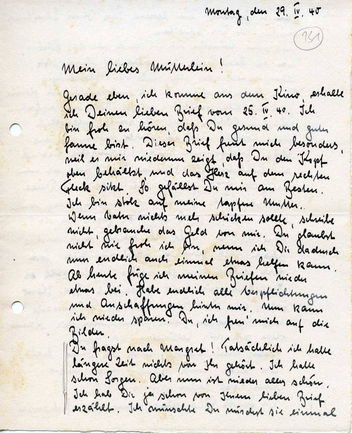 Gerade eben, ich komme aus dem Kino, erhalte ich Deinen lieben Brief vom 25.IV.40. Ich bin froh zu hören, daß Du gesund und guter Laune bist. Dieser Brief freut mich besonders, weil er mir wiederum zeigt, daß Du den Kopf oben behältst, und das Herz auf dem rechten Fleck sitzt. So gefällst Du mir am Besten. Ich bin stolz auf meine tapfere Mutter.