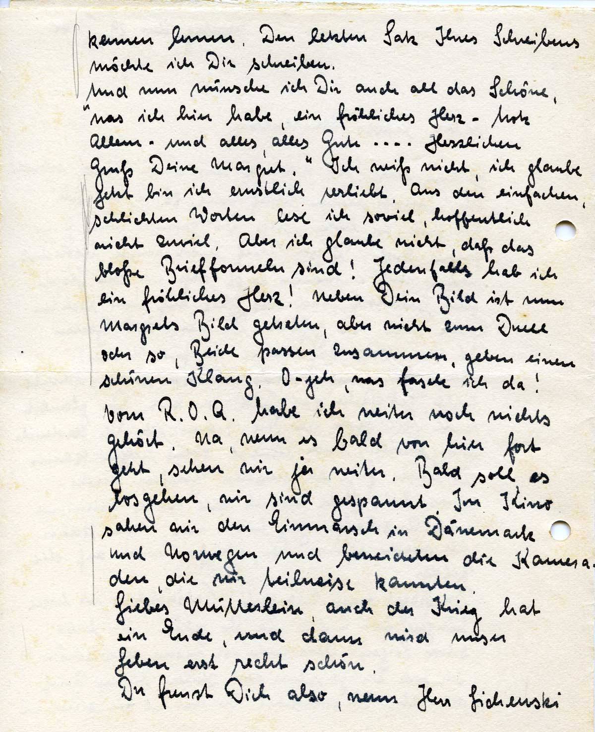 „Und nun wünsche ich Dir auch all das Schöne, was ich hier habe, ein fröhliches Herz – trotz Allem – und alles, alles Gute .... Herzlichen Gruß Deine Margret.“ Ich weiß nicht, ich glaube jetzt bin ich ernstlich verliebt. Aus den einfachen, schlichten Worten lese ich soviel, hoffentlich nicht zuviel. Aber ich glaube nicht, daß das bloße Briefformeln sind! Jedenfalls hab ich ein fröhliches Herz! Neben Dein Bild ist nun Margrets Bild getreten, aber nicht zum Duell oder so. Beide passen zusammen, geben einen schönen Klang. O-jeh, was fasele ich da!