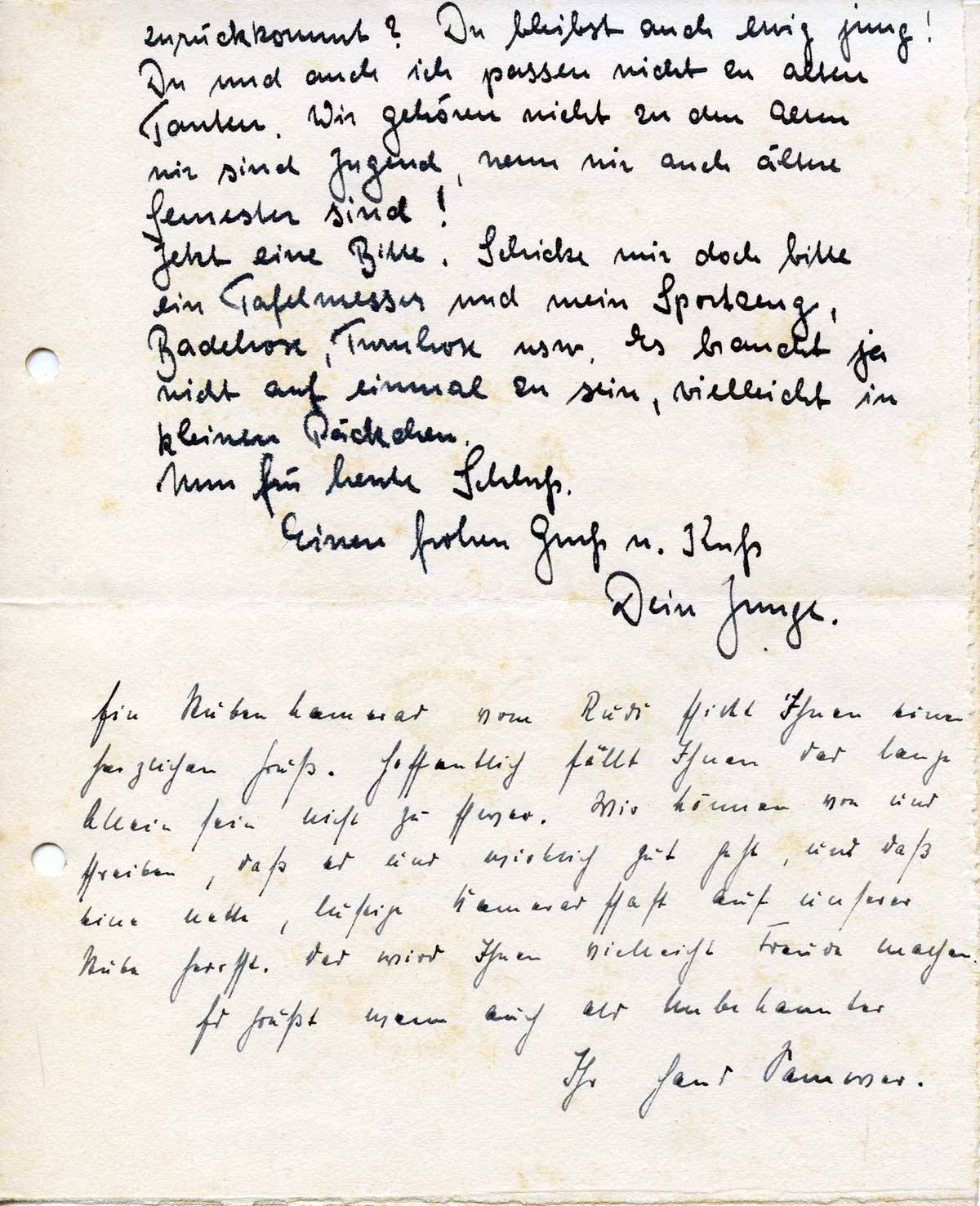 Jetzt eine Bitte. Schicke mir doch bitte ein Tafelmesser und mein Sportzeug, Badehose, Turnhose usw. Es braucht ja nicht auf einmal zu sein, vielleicht in kleinen Päckchen.