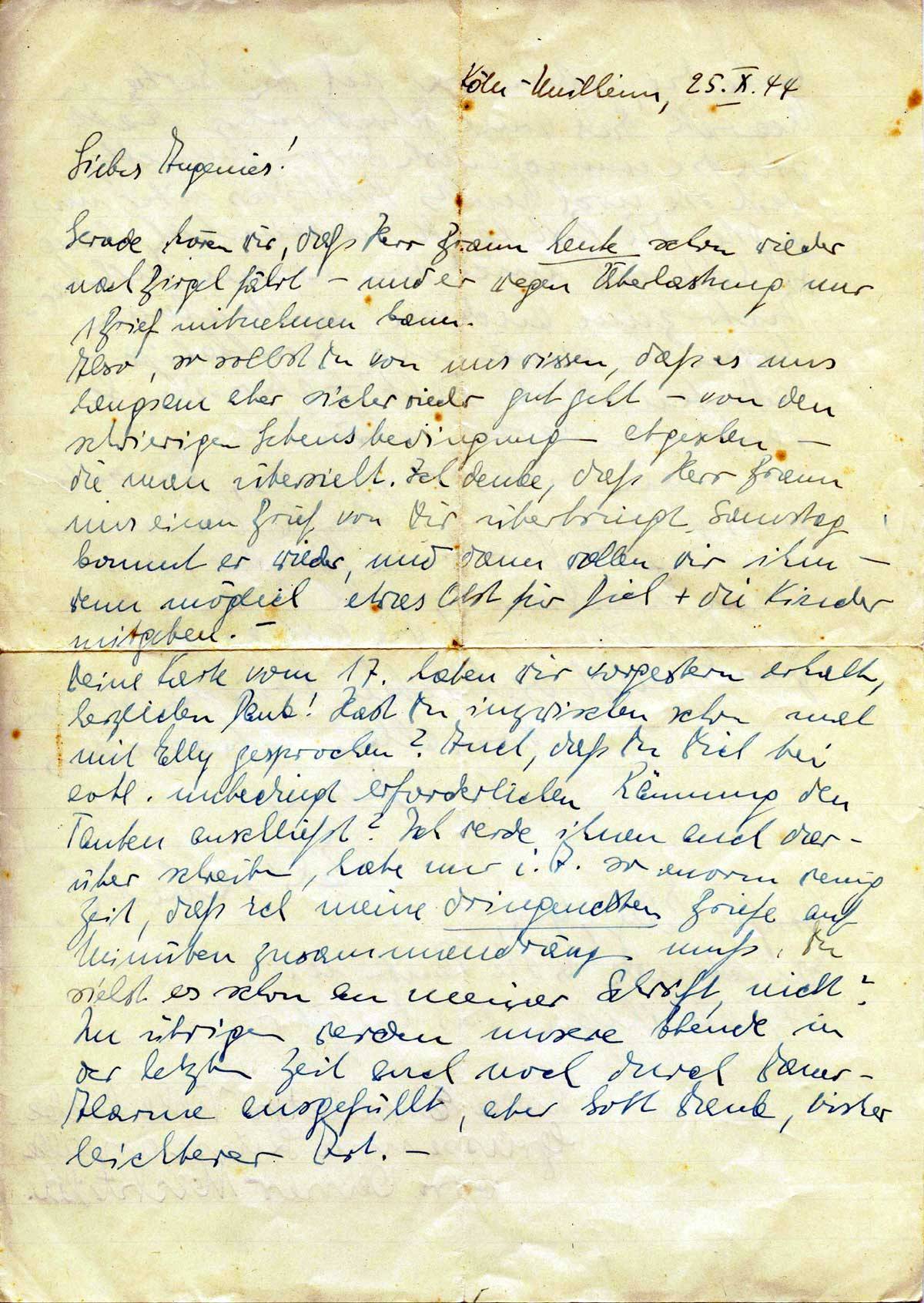 Denke Dir, gestern war ich bei Herta in Uckerath, das arme Schwesterherz hatte sich die unmöglichsten Sorgen gemacht, weil sie noch nichts Positives über uns wußte, die Post läuft unheimlich lang. So habe ich mich von einem Militär-Auto zum anderen mitnehmen lassen – eine sehr „rubbelige-abenteuerliche Fahrt“ – aber im Gedanken an Herta schön! –
