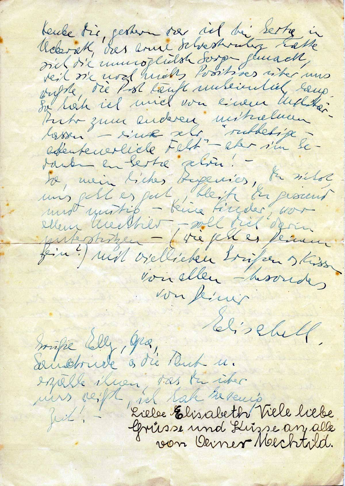 So, mein liebes Angenies, Du siehst uns geht es gut, bleibe Du gesund und mutig – Deine Kinder, vor allem Mechthild – soll Dich darin unterstützen – (wie geht es Deinem Bein?) mit viellieben Grüßen & Küssen