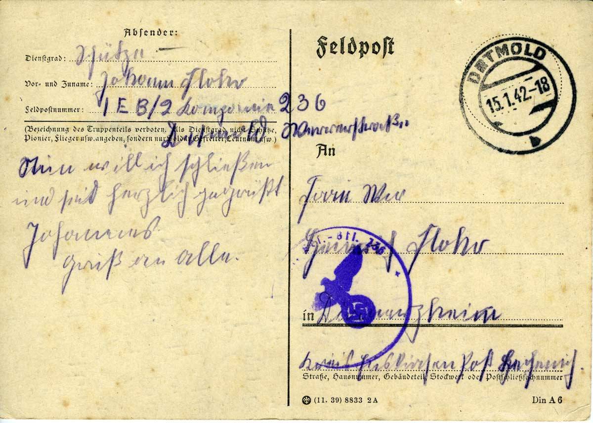 Die allerbesten Grüße aus Detmold sendet euch Johannes. Mir geht es ganz gut, was ich auch von euch hoffe. Dienstag um vier Uhr waren wir in Bonn. Dort hatten wir abends gemütlichen Abend, bis elf Uhr. Auch hatten wir zwei Komiker dort im Kaisersaal. Bier hatten wir genug und haben auch noch einmal tüchtig gelacht. Um zwölf Uhr ging’s auf die Strohsäcke. Dann haben wir geschlafen mit dem ganzen Anzug. Mittwochmorgen um sechs Uhr sind wir von Bonn nach Köln, dort sind wir eingestiegen nach Detmold. Wir waren Mittwochabend acht Uhr in der Kaserne in Detmold (... unleserlich). In der Kaserne haben wir Bettwäsche empfangen. Heute, Donnerstag, werden wir eingekleidet. Was es wenig gibt, sind Zigaretten, 12 Stück pro Woche. Denkt auch an das Schreibpapier. Verpflegung haben wir bekommen.