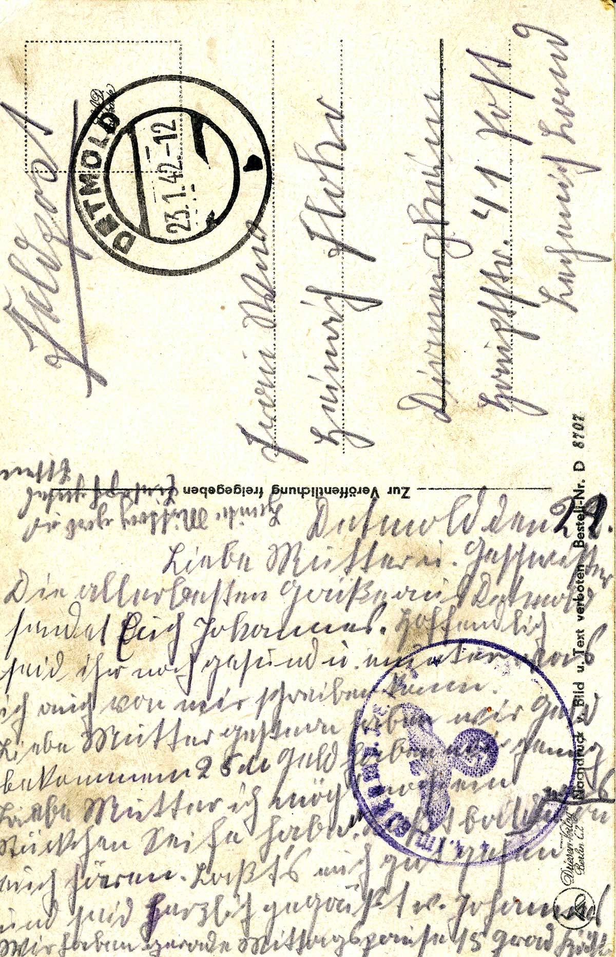 Die allerbesten Grüße aus Detmold sendet euch Johannes. Hoffentlich seid ihr noch gesund und munter, was ich auch von mir schreiben kann. Liebe Mutter, gestern haben wir Geld bekommen, 25 Mark. Ich möchte noch ein Stückchen Seife haben. Lasst bald was von euch hören. Lasst’s euch gutgehen und seid herzlich gegrüßt von Johannes.