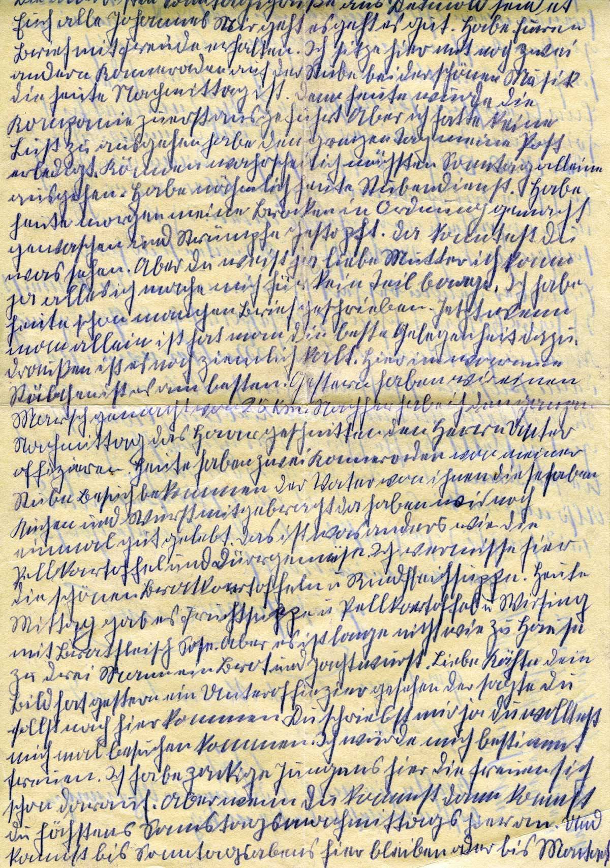 Heute haben zwei Kameraden von meiner Stube Besuch bekommen, ihre Väter, diese haben Kuchen und Wurst mitgebracht, da haben wir noch einmal gut gelebt. Das ist was anderes als die Pellkartoffeln und Dörrgemüse. Ich vermisse hier die schönen Bratkartoffeln und Rindfleischsuppe. Heute Mittag gab es Fruchtsuppe, Pellkartoffeln und Wirsing mit Bratfleisch, Soße. Aber es ist lange nicht wie zu Hause, zu drei Mann ein Brot und Jagdwurst.