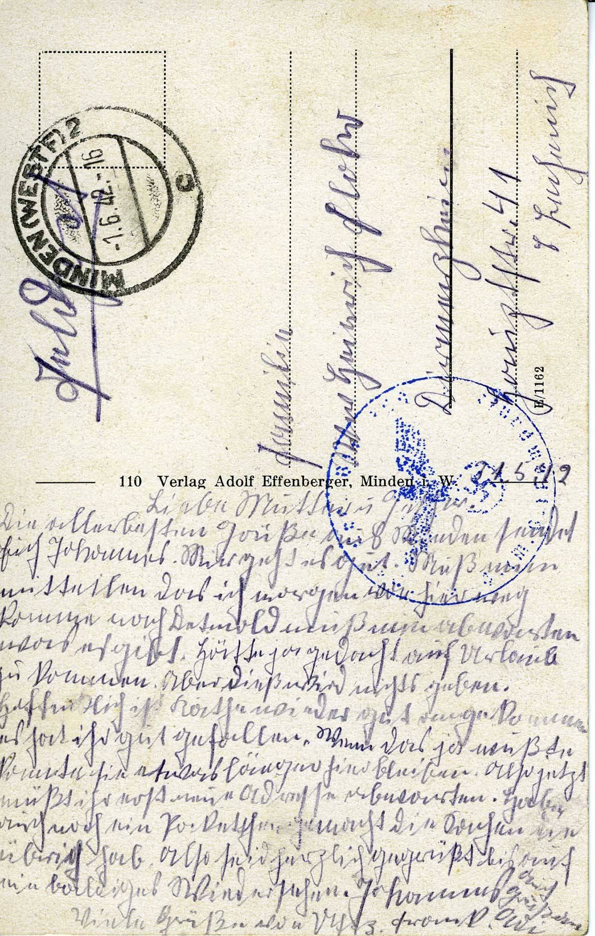 Die allerbesten Grüße aus Minden sendet euch Johannes. Mir geht es gut. Muss nun mitteilen, dass ich morgen von hier weg komme nach Detmold, muss nun ab warten, was es gibt. Hätte ja gedacht, auf Urlaub zu kommen. Aber dies wird nichts geben. Hoffentlich ist Käthe wieder gut angekommen. Es hat ihr gut gefallen. Wenn ich das wüsste, könnte sie ja etwas länger hierbleiben. Also, jetzt müsst ihr noch eine Adresse abwarten. Habe auch noch ein Paketchen gemacht, die Sachen, die ich übrig hab’.