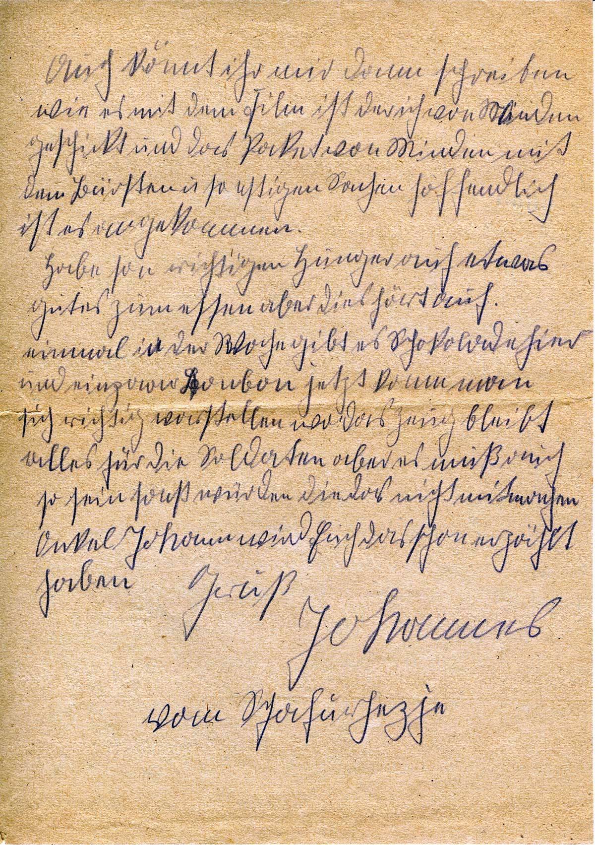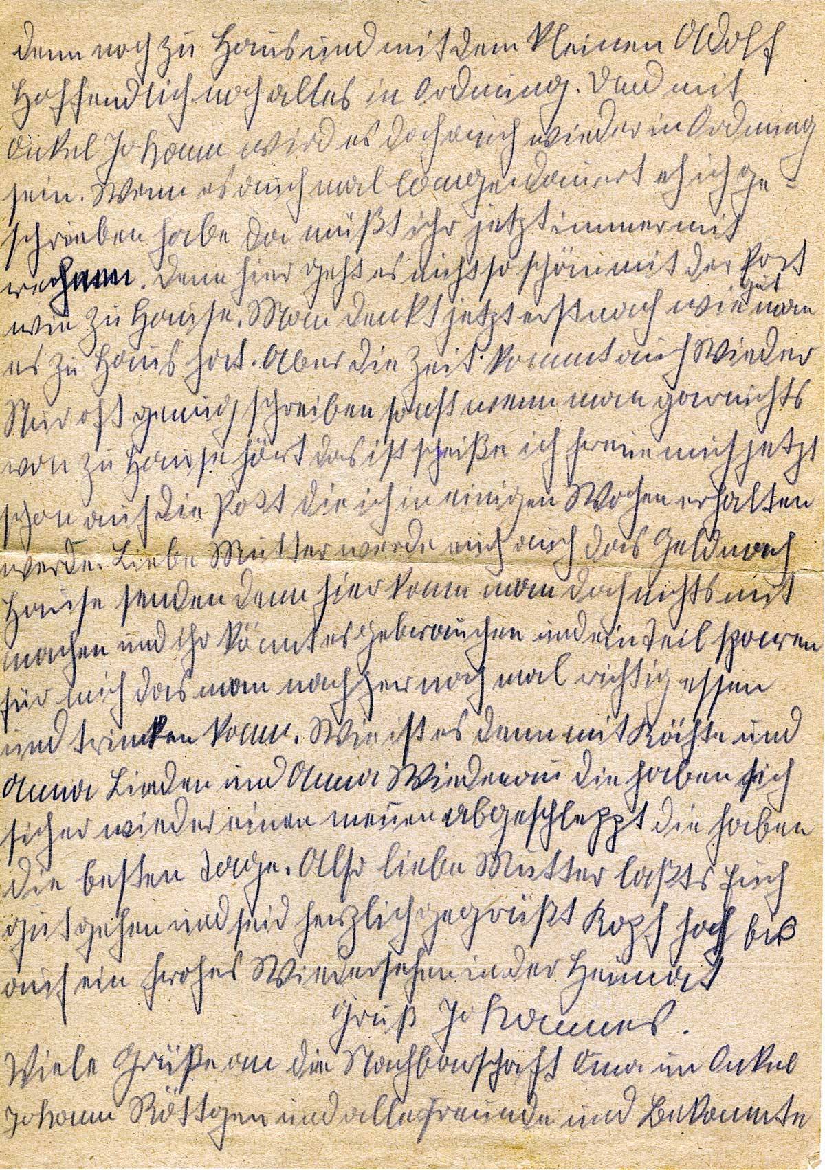 Die allerbesten Grüße aus dem fernen Osten sendet euch Johannes. Hoffentlich habt ihr meinen Brief mit Freuden erhalten. Habe ja doch nicht viel Lust zum Schreiben, weil ihr mir noch nicht schreiben könnt, bis ich die Feldpostnummer habe. Man hört und sieht nichts mehr von Zuhaus. Das ist doch eine große Scheiße hier in Russland. Werde doch hoffen, dass ihr noch alle gesund und munter seid, was ich auch noch schreiben kann. Hier in dem Dorf kann uns ja nichts passieren. Aber wir werden doch bald abhauen, es wird schon alles gutgehen. Man denkt schon gar nicht viel nach, weil man doch keine Zeit hat. Ich kann mir ja vorstellen, Mutter, dass du dir Kopfschmerzen machst, aber es ist ja nun einmal so, man kann doch nichts dran ändern.