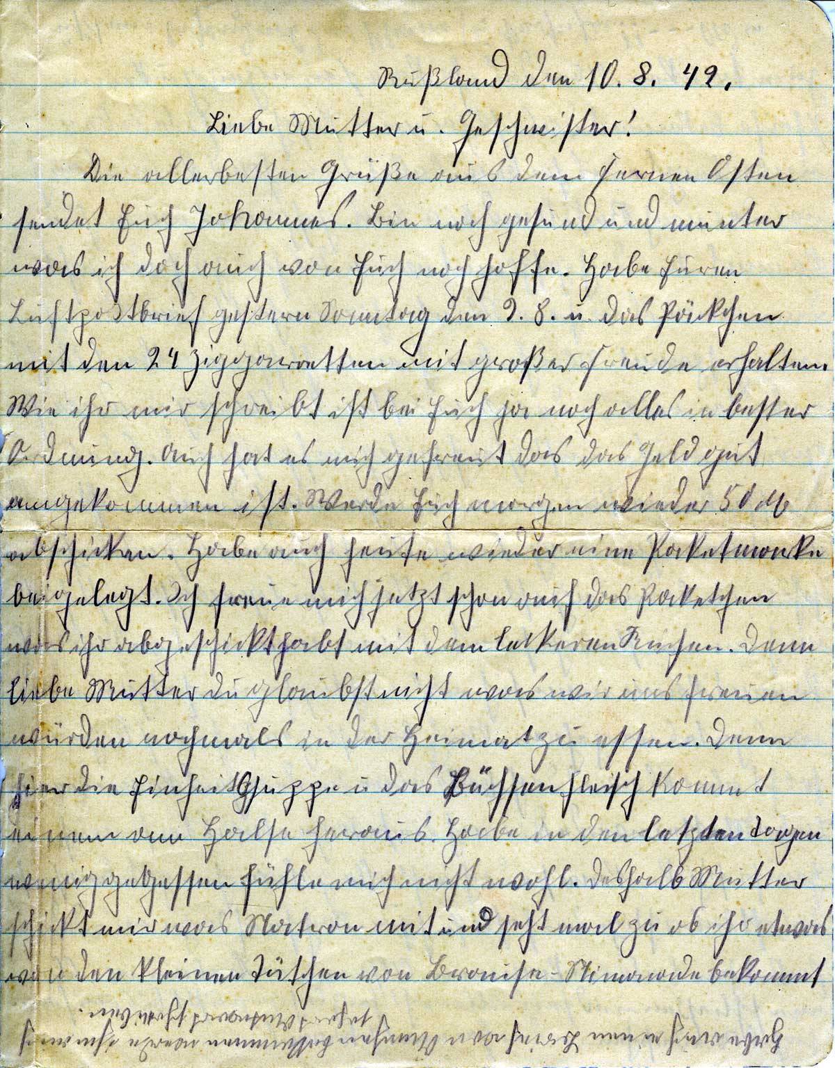Die allerbesten Grüße aus dem fernen Osten sendet euch Johannes. Bin noch gesund und munter, was ich auch von euch noch hoffe. Habe euren Luftpostbrief gestern und das Päckchen mit den 24 Zigaretten mit großer Freude erhalten. Wie ihr mir schreibt, ist bei euch noch alles in bester Ordnung. Auch hat es mich gefreut, dass das Geld gut angekommen ist. Werde euch morgen wieder 50 Mark schicken. Habe heute wieder eine Paketmarke beigelegt. Ich freue mich jetzt schon auf das Paketchen, das ihr abgeschickt habt mit dem leckeren Kuchen. Denn, liebe Mutter, du glaubst nicht, was wir uns freuen würden, nochmals in der Hei-mat zu essen. Die Einheitssuppe und das Büchsen-fleisch kommen einem zum Halse heraus. Habe in den letzten Tagen wenig gegessen, fühle mich nicht wohl. Deshalb, Mutter, schickt mir Natron mit und seht mal zu, ob ihr etwas von den kleinen Tütchen von Brauselimonade bekommt