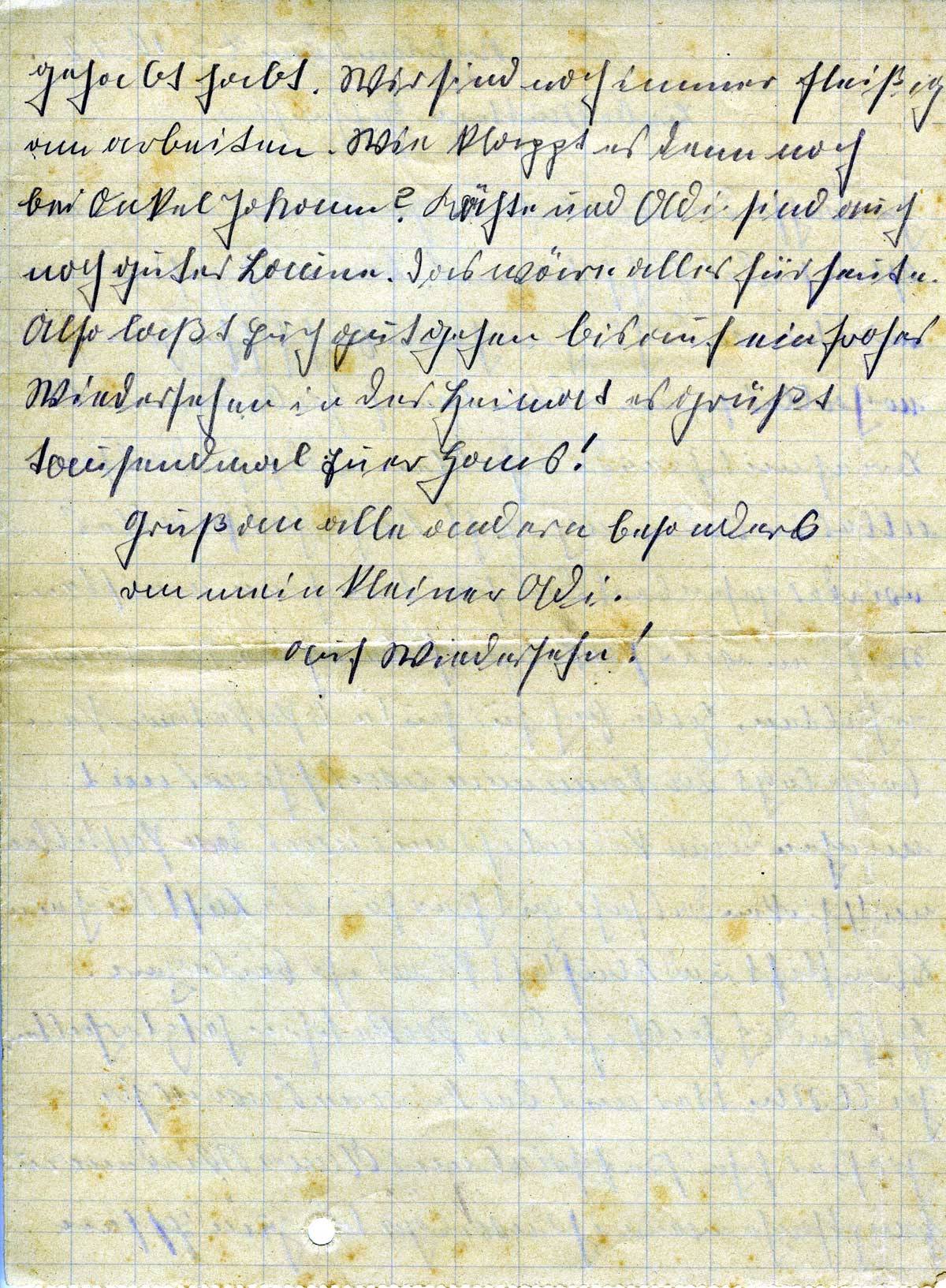 gehabt. Wir sind noch immer fleißig am arbeiten. Wie klappt es denn noch bei Onkel Johann? Käthe und Adi sind auch noch guter Laune? Das wäre alles für heute. Also lasst’s euch gutgehen bis auf ein frohes Wiedersehen in der Heimat, es grüßt tausendmal euer Hans!
