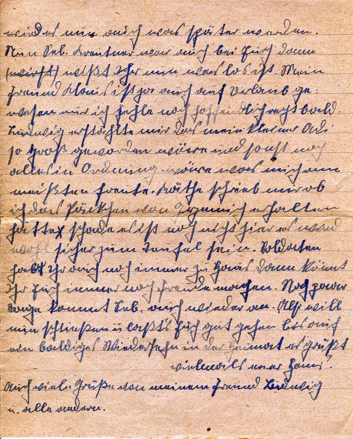 wird es nun auch was später werden. Nun Seb. Krautner war auch bei Euch dann wißt Ihr nun was los ist. Mein Freund Klaus ist ja auch auf Urlaub gewesen nur ich fehle noch hoffentlich recht bald. Ludwig erzählte mir das mein kleiner Adi so groß geworden wäre und sonst noch alles in Ordnung wäre was mich am meisten freute. Käthe schrieb mir ob ich das Päckchen von Gerzenich erhalten hätte schade es ist noch nicht hier es wird wohl sicher zum Teufel sein. Soldaten habt Ihr auch noch immer zu Haus dann könnt Ihr Euch immer noch Freude machen.. Noch paar Tage kommt Seb. auch wieder an. Also will nun schließen u. laßt’s Euch gut gehen bis auf ein baldiges Wiedersehn in der Heimat es grüßt