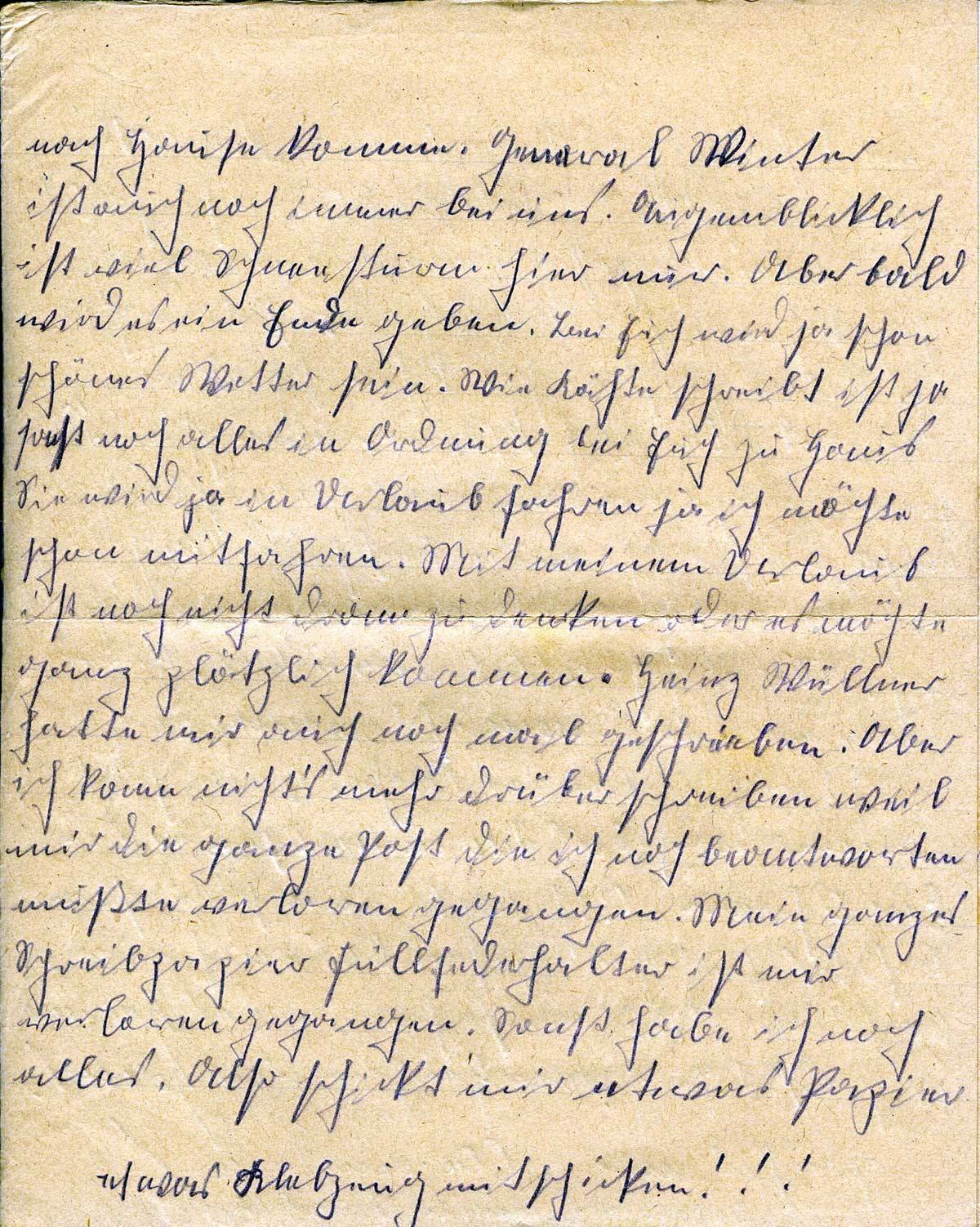 nach Hause komme. General Winter ist auch noch immer bei uns. Augenblicklich ist viel Schneesturm hier. Aber bald wird es ein Ende geben. Bei Euch wird ja schon schönes Wetter sein. Wie Käthe schreibt ist ja fast noch alles in Ordnung bei Euch zu Haus. Sie wird ja in Urlaub fahren ja ich möchte schon mitfahren. Mit meinem Urlaub ist noch nicht dran zu denken oder es müßte ganz plötzlich kommen. Heinz Wüllner hatte mir auch noch mal geschrieben. Aber ich kann nichts mehr drüber schreiben weil mir die ganze Post die ich noch beantworten müßte verloren gegangen ist. Mein ganzes Schreibpapier Füllfederhalter ist mir verloren gegangen. Sonst habe ich noch alles. Also schickt mir etwas Papier