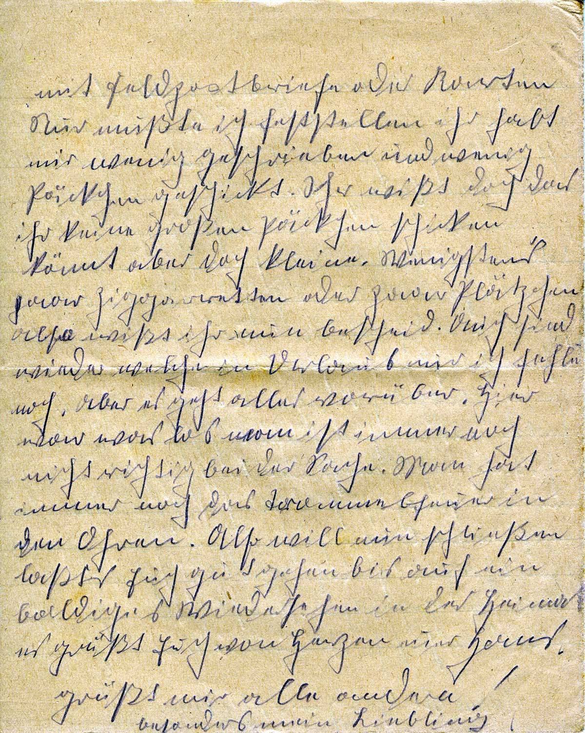 Zunächst die allerbesten Grüße aus weiter Ferne sendet Euch euer Hans. Bin noch gesund und munter geblieben. Habe euren Ib. Brief mit großer Freude erhalten. Die Post war lange ausgeblieben. Hier waren in den letzten 10 Tagen schwere Abwehrkämpfe. Ich kann Euch sagen da geht einem der Hut fliegen. Dies werde ich in meinem Leben nie vergessen die 8 Tage die wir drin waren. Die Hälfte von unserem Zug ist verwundet worden. Ich habe nun Glück gehabt noch mehr wie Glück das ich mit heilen Knochen herausgekommen bin. Ludwig ist auch noch gesund. Aber ich kann es Euch nicht alles schreiben ich werde es Euch erzählen wenn ich gesund