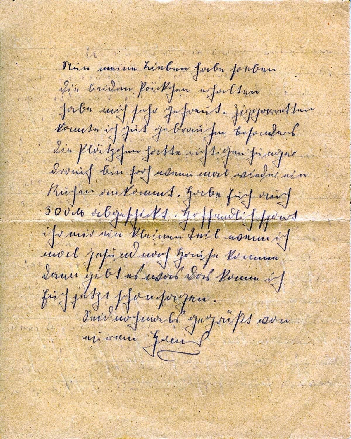 Nun meine Lieben habe soeben die beiden Päckchen erhalten. Habe mich sehr gefreut. Zigaretten konnte ich gut gebrauchen besonders die Plätzchen hatte richtigen Hunger darauf bin froh wenn mal wieder ein Kuchen ankommt. Habe Euch auch 300 M abgeschickt. Hoffendlich spart ihr mir einen kleinen Teil wenn ich mal gesund nach Hause komme dann gibt es was das kann ich Euch jetzt schon sagen. Seid nochmals gegrüßt von eurem Hans.