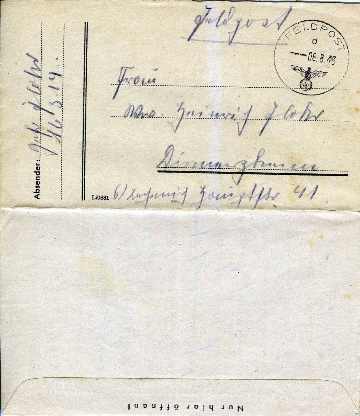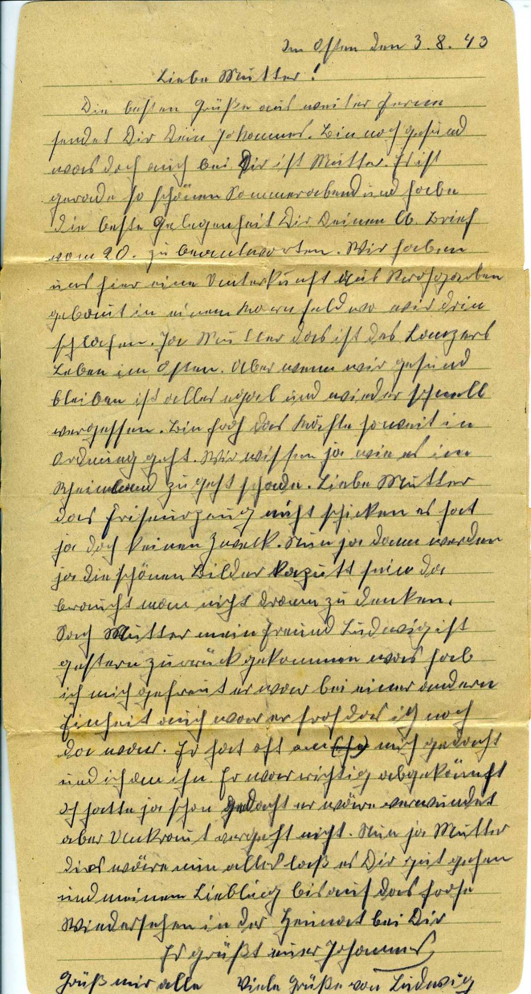 Die besten Grüße auf weiter Ferne sendet Dir dein Johannes. Bin noch gesund was doch auf bei Dir ist Mutter. Es ist gerade so schöner Sommerabend und habe die beste Gelegenheit Dir Deinen lb. Brief vom 20. zu beantworten. Wir haben uns hier eine Unterkunft aus Strohgarben gebaut in einem Kornfeld wo wir dring schlafen. Ja Mutter das ist des Landsers Leben im Osten. Aber wenn wir gesund bleiben ist alles egal und wieder schnell vergessen. Bin froh das Käthe so weit in Ordnung geht. Wir wissen ja wie es im Rheinland zugeht schade. Liebe Mutter das Friseurzeug nicht schicken es hat ja doch keinen Zweck. Nun ja dann werden die schönen Bilder kaputt sein da braucht man nicht dran zu denken. Ach Mutter mein Freund Ludwig ist gestern zurückgekommen was hab ich mich gefreut es war bei einer andern Einheit auch war er froh das ich noch da war. Er hat oft an mich gedacht und ich an ihn. Er war richtig abgekämpft. Ich hatte ja schon gedacht er wäre verwundet aber Unkraut vergeht nicht. Nun ja Mutter dies wäre nun alles laß es Dir gut gehen und meinen Liebling bis auf das frohe Wiedersehen in der Heimat bei Dir.