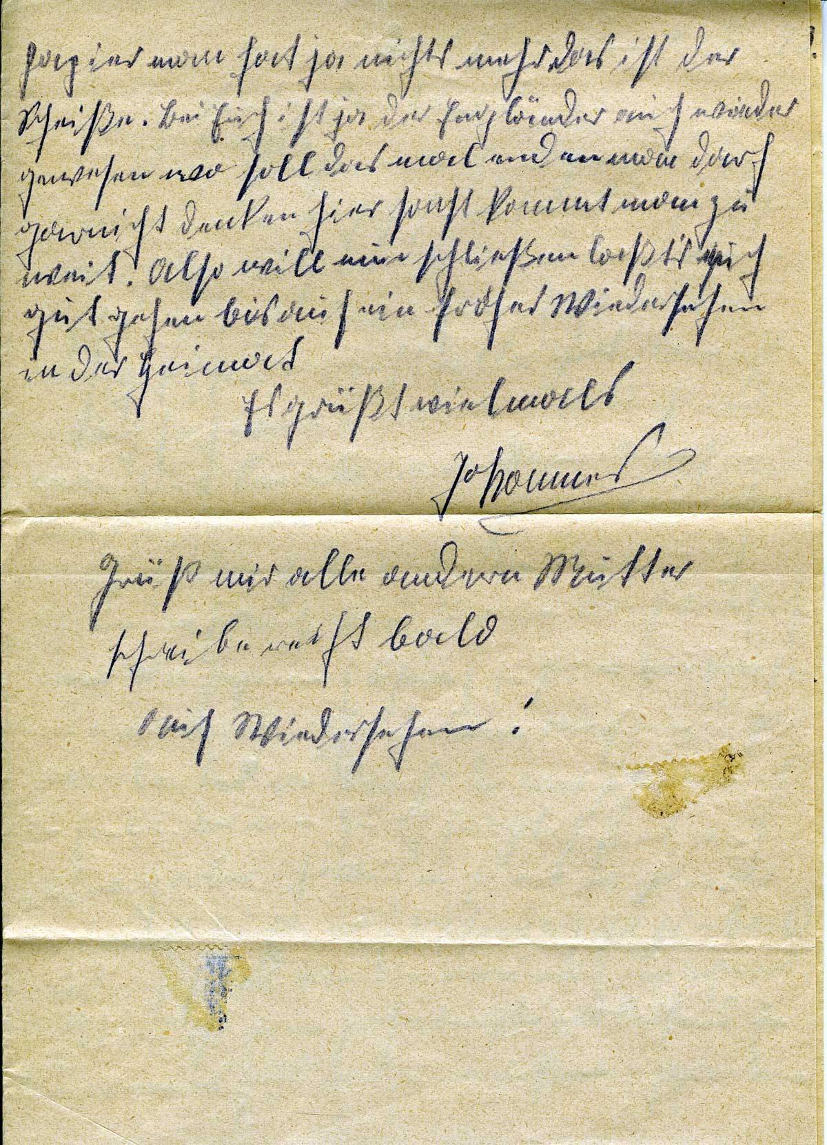 hab ich fast ja nichts mehr das ist der Scheiße. Bei Euch ist ja der Engländer auch wieder gewesen wo soll das mal enden man darf gar nicht denken hier sonst kommt man zu weit. Also will nun schließen laßt’s Euch gut gehen bis auf ein frohes Wiedersehen in der Heimat. Es grüßt vielmals Johannes.
