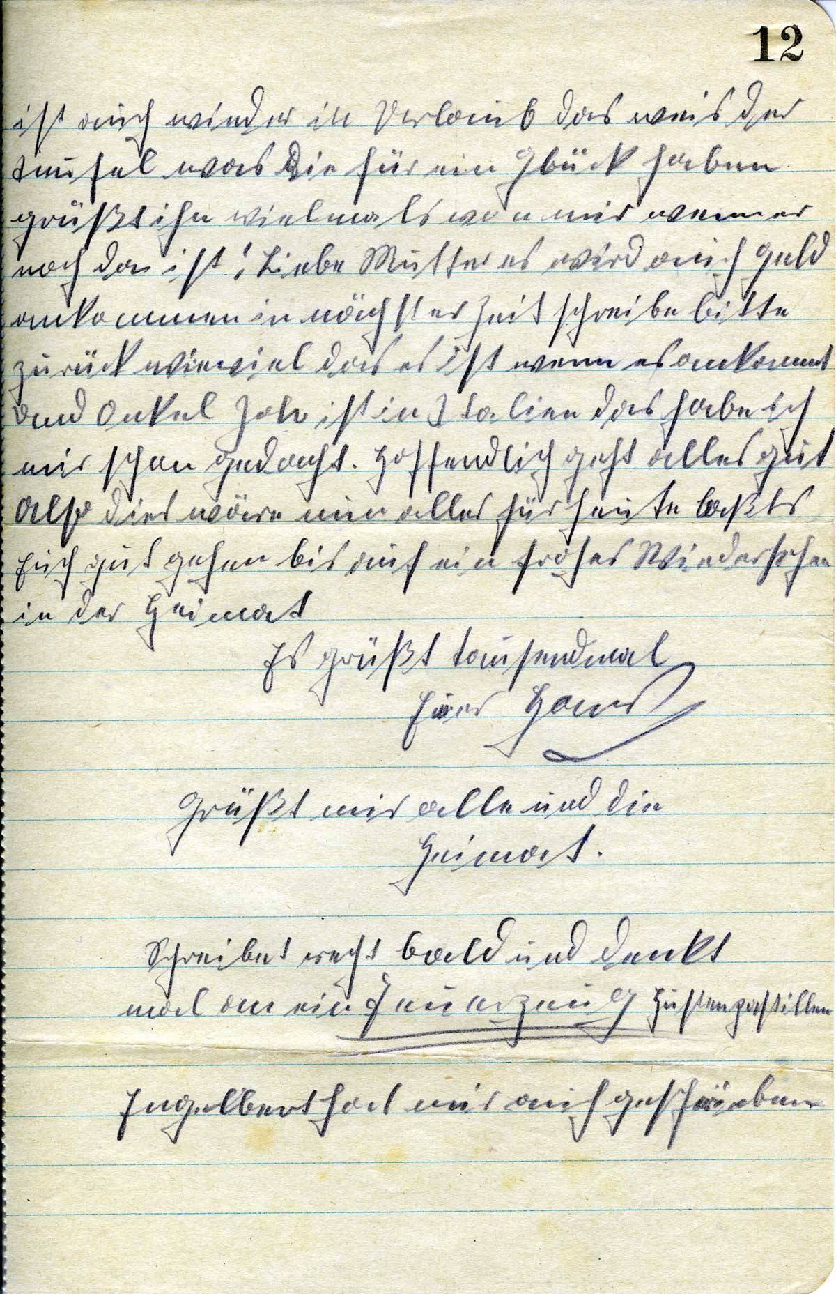 ist auch wieder in Urlaub das weis der Teufel was die für ein Glück haben grüßt ihn vielmals von mir wenn er noch da ist! Liebe Mutter es wird auch Geld ankommen in nächster Zeit schreibe bitte zurück wie viel das es ist wenn es ankommt. Und Onkel Joh. Ist in Italien das habe ich mir schon gedacht. Hoffentlich geht alles gut. Also dies wäre nun alles für heute laßt’s Euch gut gehen bis auf ein frohes Wiedersehen in der Heimat.
