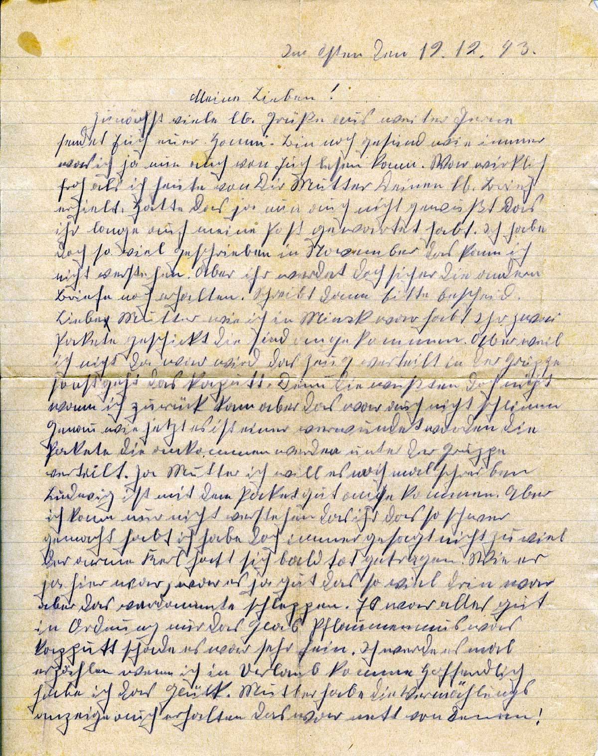 Zunächst viele lb. Grüße aus weiter Ferne sendet Euch euer Hansi. Bin noch gesund wie immer was ich ja nun auch von Euch lesen kann. War wirklich froh als ich heute von Dir Mutter Deinen lb. Brief erhielt. Hatte das ja nun auch nicht gewusst das ihr lange auf meine Post gewartet habt. Ich habe doch so viel geschrieben im November das kann ich nicht verstehen. Aber Ihr werdet doch sicher die anderen Briefe noch erhalten. Schreibt dann bitte Bescheid. Liebe Mutter wie ich in Minsk war habt Ihr zwei Pakete geschickt die sind angekommen. Aber weil ich nicht da war wird das Zeug verteilt in der Gruppe sonst geht das kaputt. Denn die wussten doch nicht wann ich zurück kam aber das war auch nicht schlimm. Genau wie jetzt es ist einer verwundet worden die Pakete die ankommen werden unter der Gruppe verteilt. Ja Mutter ich will es noch mal schreiben Ludwig ist mit dem Paket gut angekommen. Aber ich kann nur nicht verstehen das ihr das so schwer gemacht habt ich habe doch immer gesagt nicht zu viel der arme Kerl hat sich bald tot getragen. Wie er ja hier war, war es ja gut das so viel drin war aber das verdammte schleppen. Ja war alles gut in Ordnung nur das Glas Pflaumenmus war kaputt schade es war sehr fein. Ich werde es mal erzählen wann ich in Urlaub komme. Hoffendlich habe ich das Glück. Mutter habe die Vermählungsanzeige auch erhalten das war nett von denen!