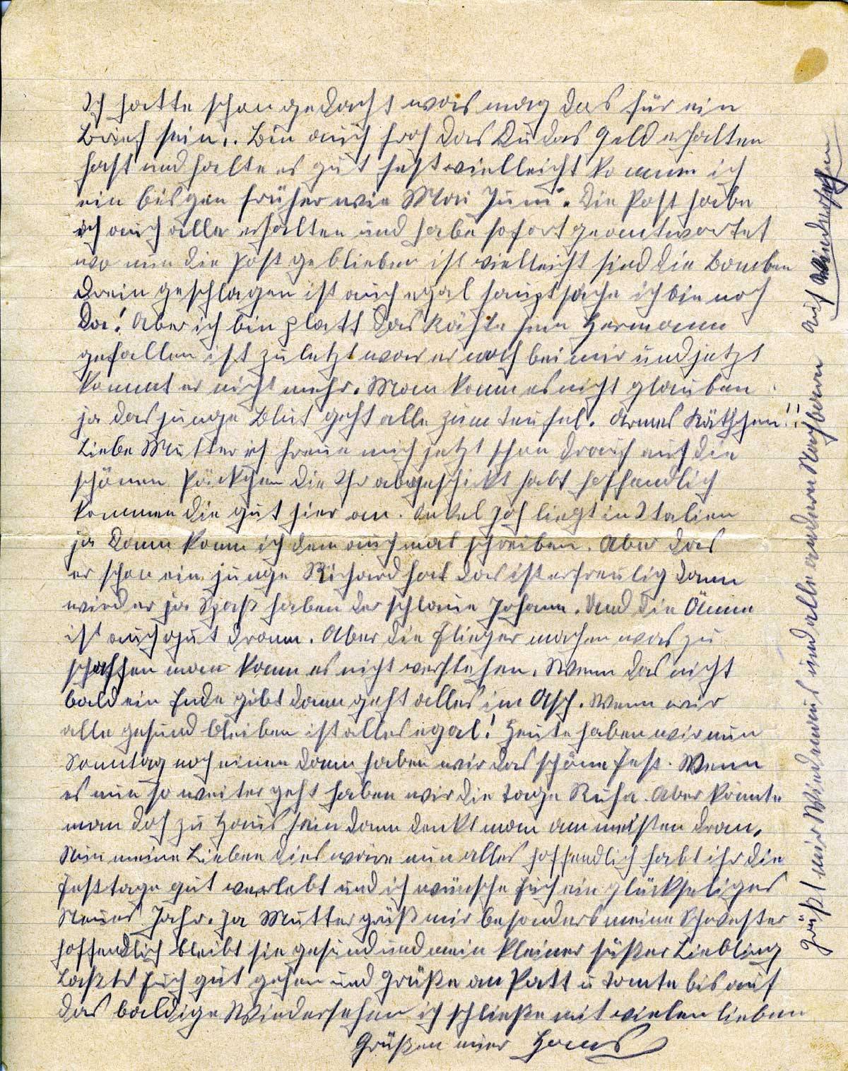Ich hatte schon gedacht was mag das für ein Brief sein. Bin auch froh das Du das Geld erhalten hast und halte es gut fest vielleicht komme ich ein bischen früher wie Mai Juni. Die Post habe ich auch alle erhalten und habe sofort geantwortet wo nun die Post geblieben ist vielleicht sind die Bomben drein geschlagen ist auch egal Hauptsache ich bin noch da. Aber ich bin platt das Käthe sein Hermann gefallen ist zuletzt war er noch bei mir und jetzt kommt er nicht mehr. Man kann das nicht glauben ja das junge Blut geht alles zum Teufel .Armes Käthchen!! Liebe Mutter ich freue mich jetzt schon drauf auf die schönen Päckchen die Ihr abgeschickt habt hoffentlich kommen die gut hier an. Onkel Joh. liegt in Italien ja dann kann ich dem auch mal schreiben. Aber das er schon ein junge Richard hat das ist erfreulig dann wird er ja Spaß haben der schlaue Johann. Und die Änne ist auch gut dran. Aber die Flieger machen was zu schaffen man kann es nicht verstehen. Wenn das nicht bald ein Ende gibt dann geht alles im Arsch. Wenn wir alle gesund bleiben ist alles egal! Heute haben wir nun Sonntag noch einen dann haben wir die Tage Ruhe. Aber könnte man doch zu Haus sein dann denkt man am meisten dran. Nun meine Lieben dies wäre nun alles hoffentlich habt ihr die Festtage gut verlebt und ich wünsche Euch ein glückseliges Neues Jahr. Ja Mutter grüß mir besonders meine Schwester. Hoffentlich bleibt sie gesund und mein kleiner süßer Liebling laßts Euch gut gehen und Grüße an Patt und Tante bis auf das baldige Wiedersehen ich schließe mit vielen lieben