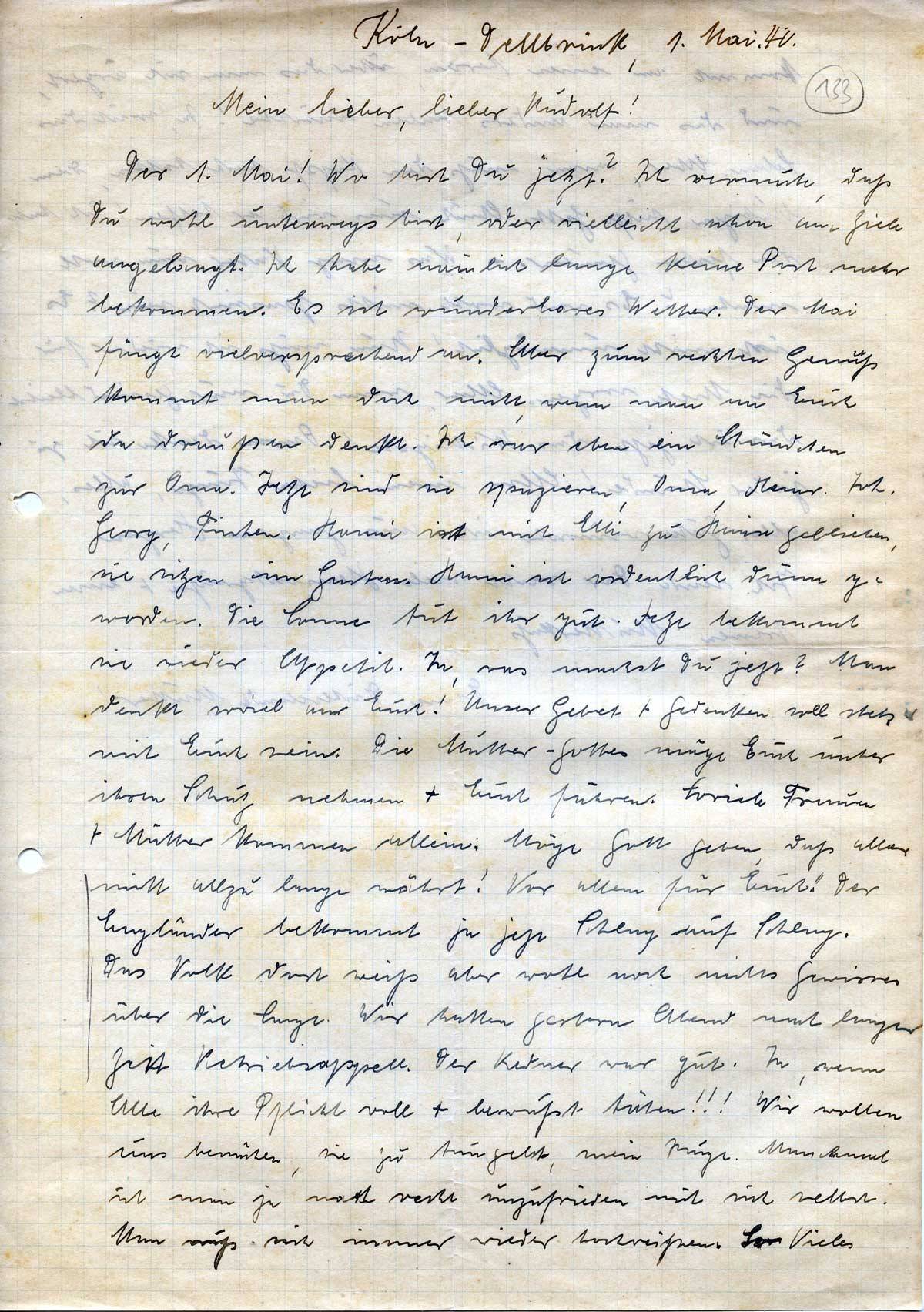 Der 1. Mai! Wo bist Du jetzt? Ich vermute, daß Du wohl unterwegs bist, oder vielleicht schon am Ziele angelangt. Ich habe nämlich lange keine Post mehr bekommen. Es ist wunderbares Wetter. Der Mai fängt vielversprechend an. Aber zum rechten Genuß kommt man doch nicht, wenn man an Euch da draußen denkt. Ich war eben ein Stündchen zur Oma. Jetzt sind sie spazieren, Oma, Heinr. Joh. Georg, Finchen. Hanni ist mit Elli zu Hause geblieben, sie sitzen im Garten. Hanni ist ordentlich dünn geworden. Die Sonne tut ihr gut. Jetzt bekommt sie wieder Appetit. Ja, was machst Du jetzt? Man denkt soviel an Euch! Unser Gebet + Gedenken soll stets mit Euch sein. Die Mutter-Gottes möge Euch unter ihren Schutz nehmen + Euch führen. Soviele Frauen + Mütter kommen allein. Möge Gott geben, daß alles nicht allzu lange währt! Vor allem für Euch! Der Engländer bekommt ja jetzt Schlag auf Schlaga. Das Volk dort weiß aber wohl noch nichts Gewisses über die Lage. Wir hatten gestern Abend nach langer Zeit Betriebsappell. Der Redner war gut. Ja, wenn Alle ihre Pflicht voll + bewußt täten!!! Wir wollen uns bemühen, sie zu tun gelt, mein Junge. Manchmal ist man ja noch recht unzufrieden mit sich selbst. Man muß sich immer wieder hochreißen. Vieles